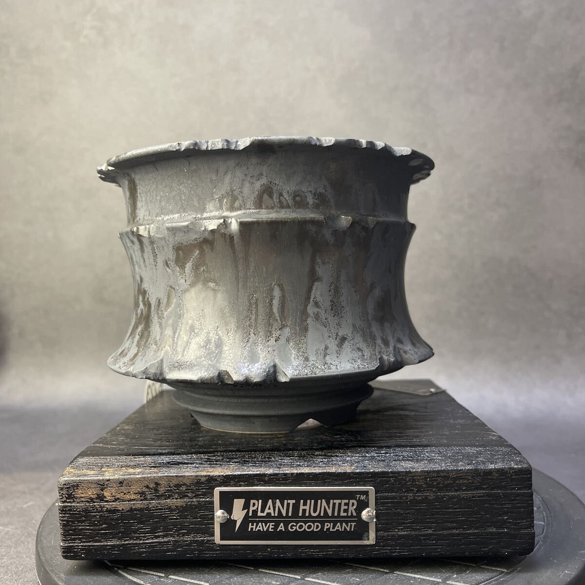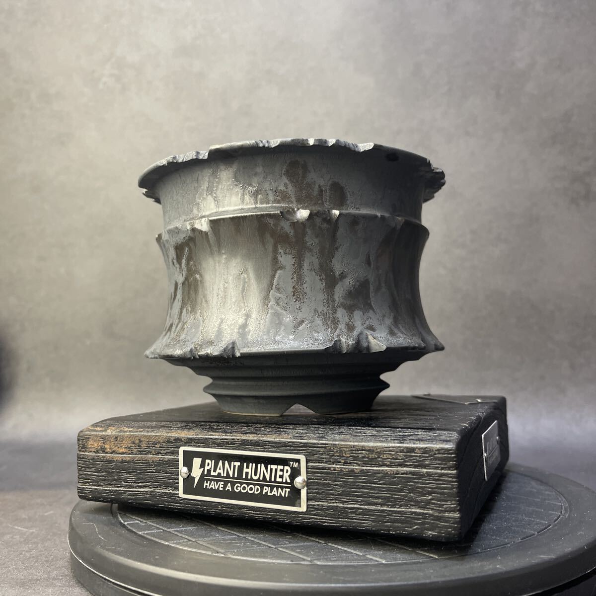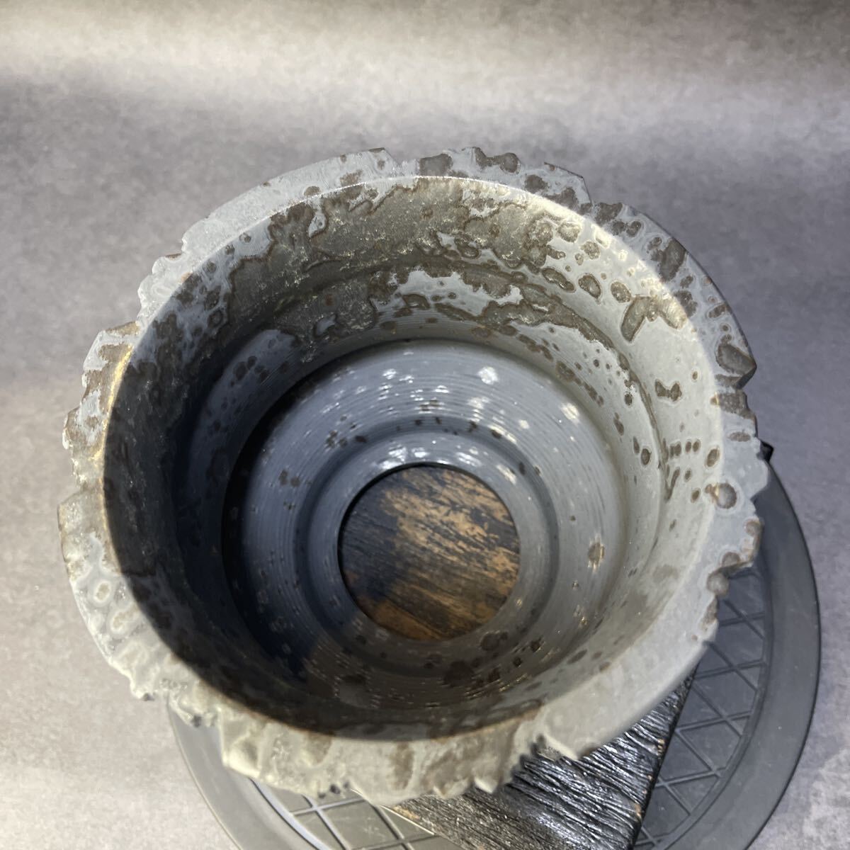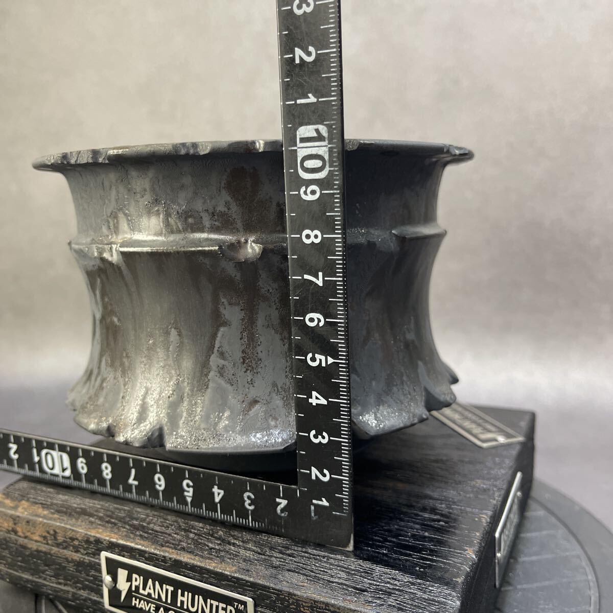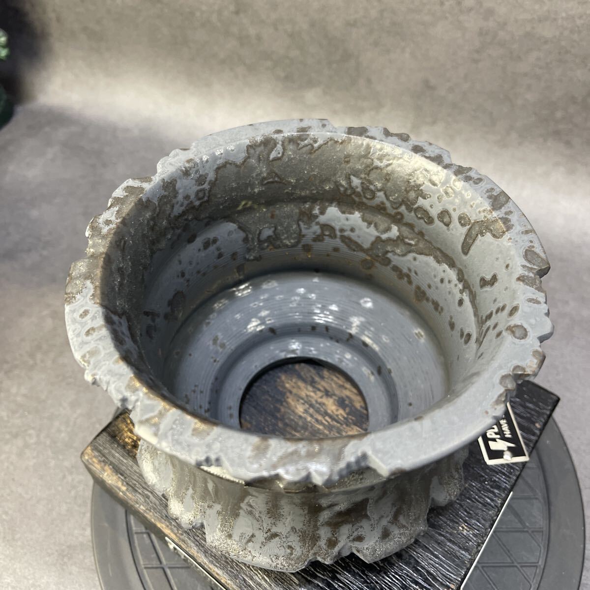 冷たいグレーを基調に、火山灰のような流れ模様と金属質の斑点が重なり合う独特な釉景の一点です。表面には熔岩が冷えて固まったような自然なテクスチャが現れ、同じ表情を再現することの難しい作品となっています。