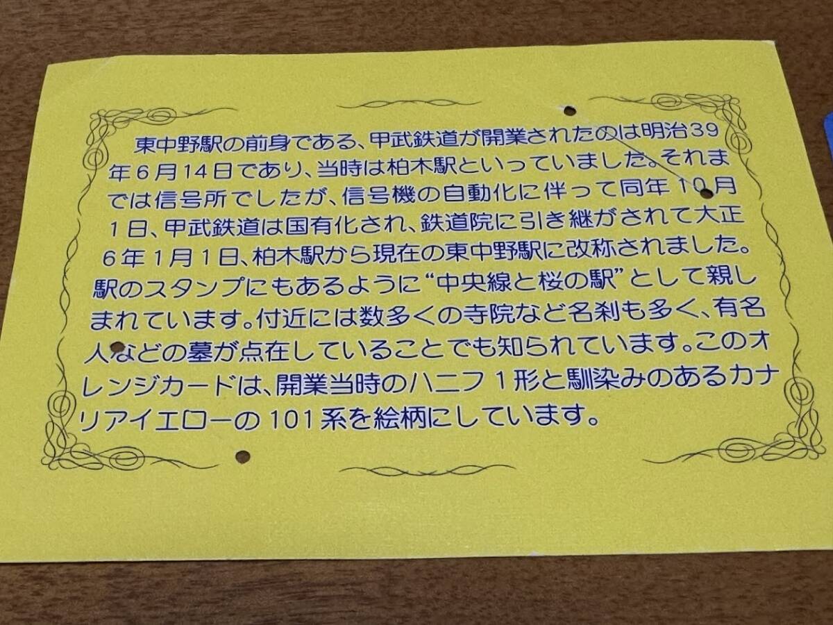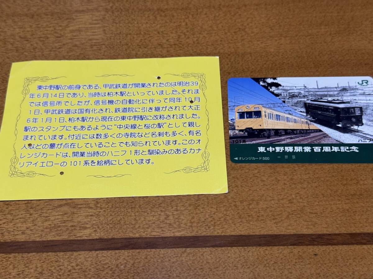 東中野駅開業100周年記念のオレンジカード500円分です。未使用です。台紙は保管中の小傷や端部の折れがあります。レターパックライト(430円)で発送します。以上を了承の上、あくまでも中古品としてご理解いただきノークレームノーリターンをご理解いただける方のみご入札ください。写真に写っているものがすべてです。細かいことにこだわる方の入札はご遠慮ください。