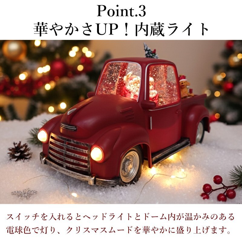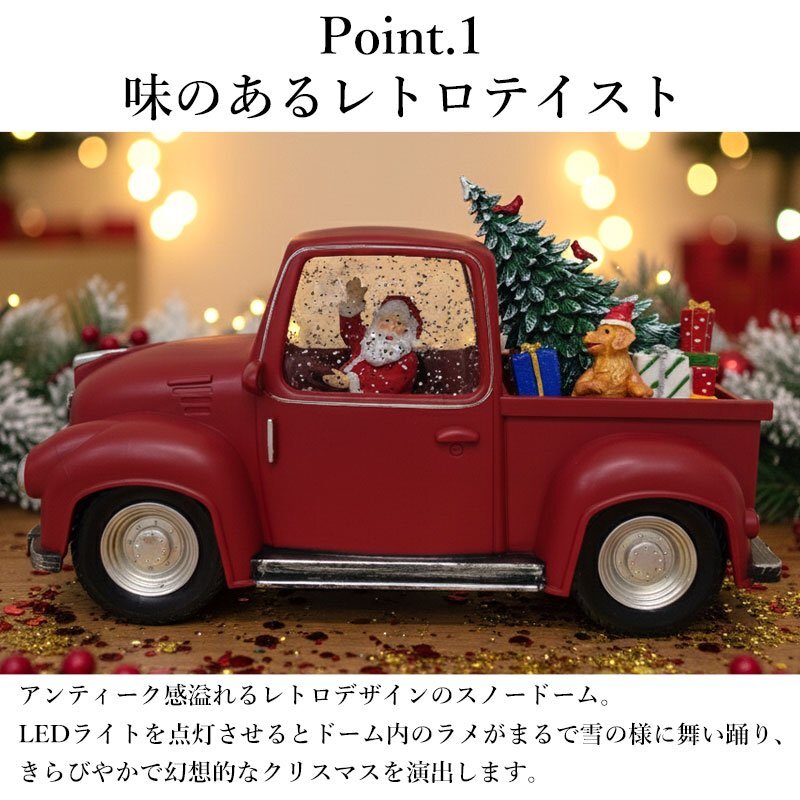 ![]() クリスマスの夜、プレゼントをいっぱい積んだサンタトラックが走り出す―― そんなワクワク感を閉じ込めた、レトロでかわいらしいスノードームライトです。 鮮やかなレッドカラーのヴィンテージトラックに、サンタクロースとクリスマスツリー、たくさんのギフトボックス。 ドームの中ではキラキラと雪が舞い、内蔵LEDライトが温かな光で幻想的な雰囲気を演出します。 インテリアライトとしても存在感抜群で、リビングや玄関、ツリーの足元などに飾るだけでお部屋が一気にホリデームードに。 大人も子どもも楽しめる、心温まるクリスマスインテリアです。 給電方法は2つ、付属のUSBコードで使用する他、 単三電池3本でコードレスとしての使用も可能! 精巧に作られている為、ライトを点灯させずに 単体でオブジェとして使用しても存在感抜群です! ギフトなどにもおすすめです! ●動作パターン● ・未点灯 ・LED点灯(音楽なし) ・LED点灯(音楽あり) ※乾電池、USB出力用のアダプターは付属しておりません。 点灯時の様子は動画でご覧くださいませ。 動画はこちら ↓↓↓↓↓↓↓↓↓↓↓↓↓ こちらをクリック! カラー:レッド サイズ(約): 高さ14cm×幅28cm×奥行き12cm コード長さ(約):98cm 重量(約):1.7kg 素材:プラスチック 【給電方法】 単三電池×3/USBコード |