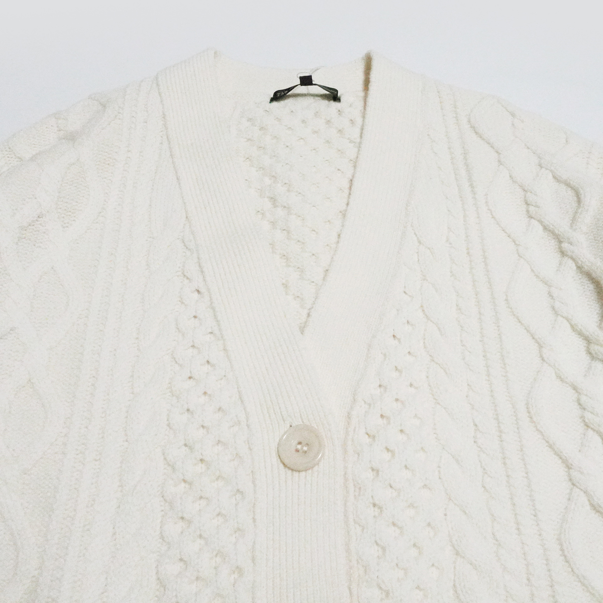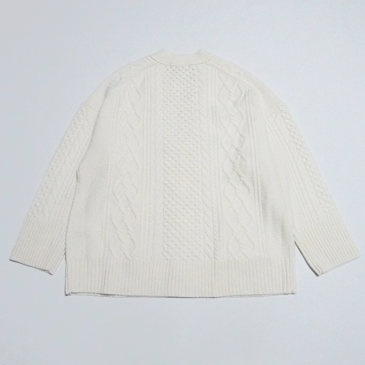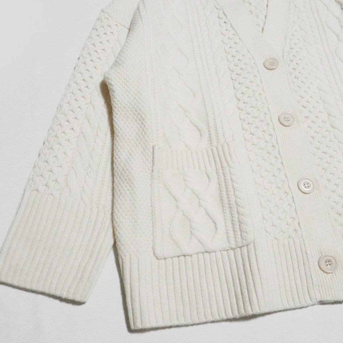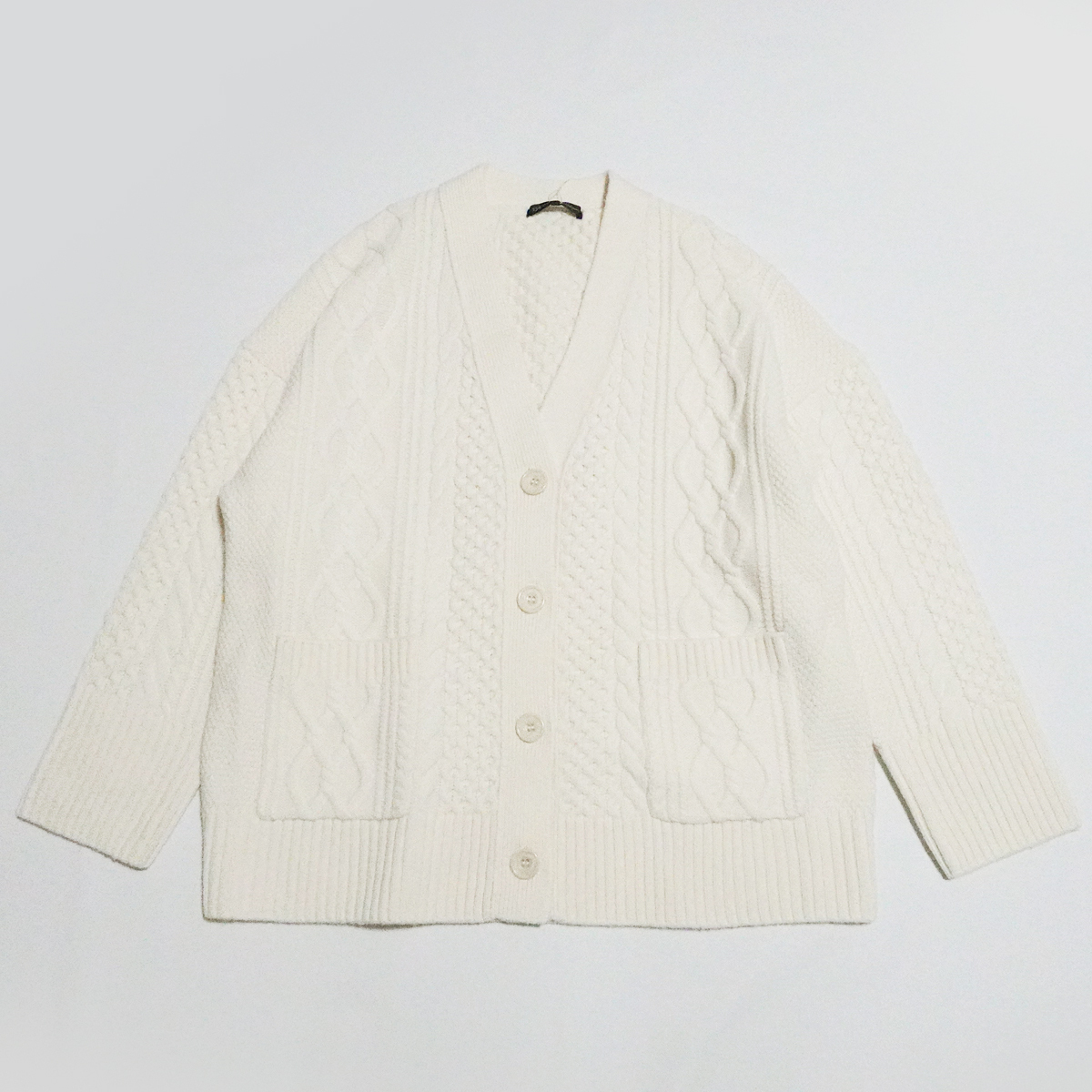 伝統的なアラン柄で編みたてたVネックカーディガンです。