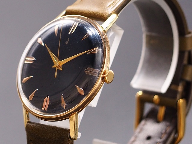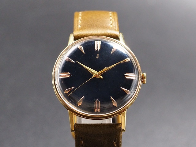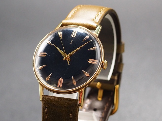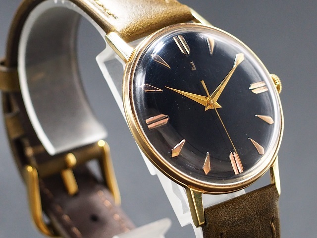 ブラックの文字盤の12時下に「J」のロゴがアップライト、クサビ型のインデックスと時針分針はともにゴールド、洗練された高級感が感じられるデザインです。