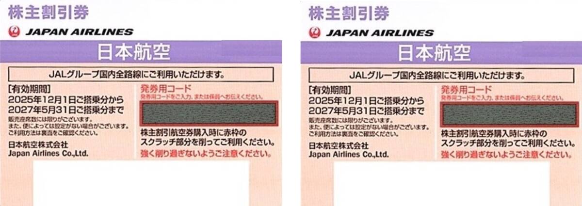 【2枚セット/発券用コードのみ連絡/現品発送は\200】 日本航空 JAL 株主割引券 2027年5月31日まで