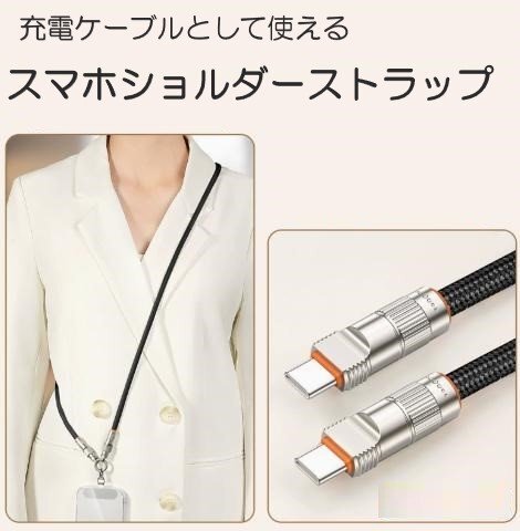 スマホショルダーストラップ ブラック 120cm 充電ケーブル 2in1 TypeC + TypeC 充電コード 斜めがけ 肩掛け