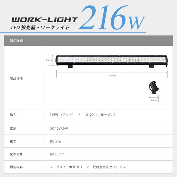 LED ワークライト 作業灯 投光器 前照灯 補助灯 デイライト CREE 216W 15120Lm 12V/24V対応 車 小型船舶 国内検査後出荷 宅配便 送料無料