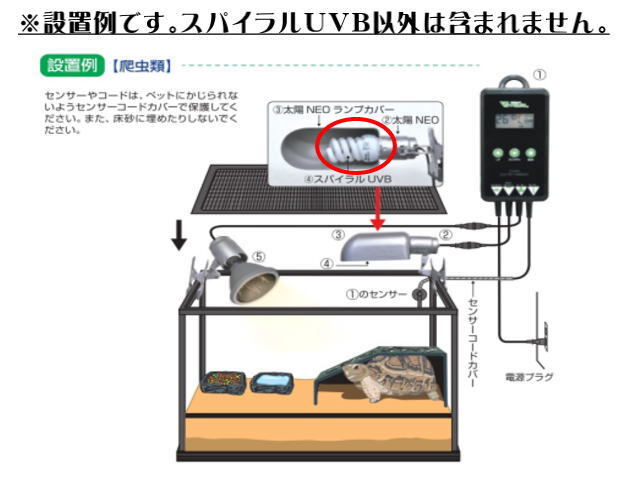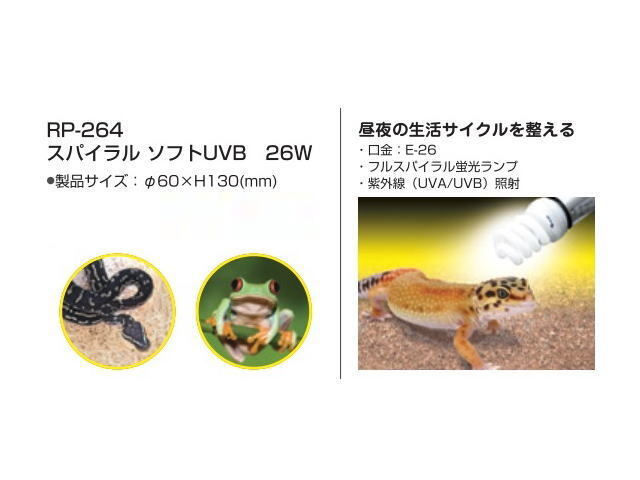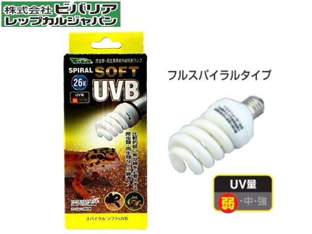 | 商品名:スパイラルソフトUVB26W ■UV量は(弱)です。 紫外線弱めです。 比較的弱い紫外線を必要とする爬虫類・両生類に最適です。 自然界での多くの爬虫類や両生類は太陽光に照らされて 生活しております。 太陽光には紫外線(UV)が含まれており、新陳代謝を促進します。 本品は、ヘビやヤモリ、両生類等の紫外線を必要とする 生体の屋内飼育下で不足しがちな紫外線を補います。 爬虫類専用のクリップスタンドをご使用下さい。 サイズ:Φ60x130mm 口金:E26 用途:室内用 ■注意点 本品はケージ内を暖める能力はありません。 水滴の飛散で破損の恐れがあります。 紫外線効果を保つために、使用1年を目安に交換をお勧めします。 |