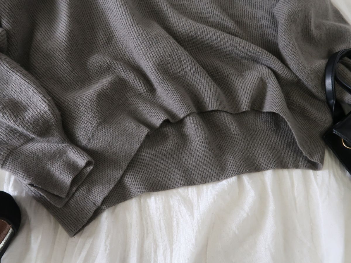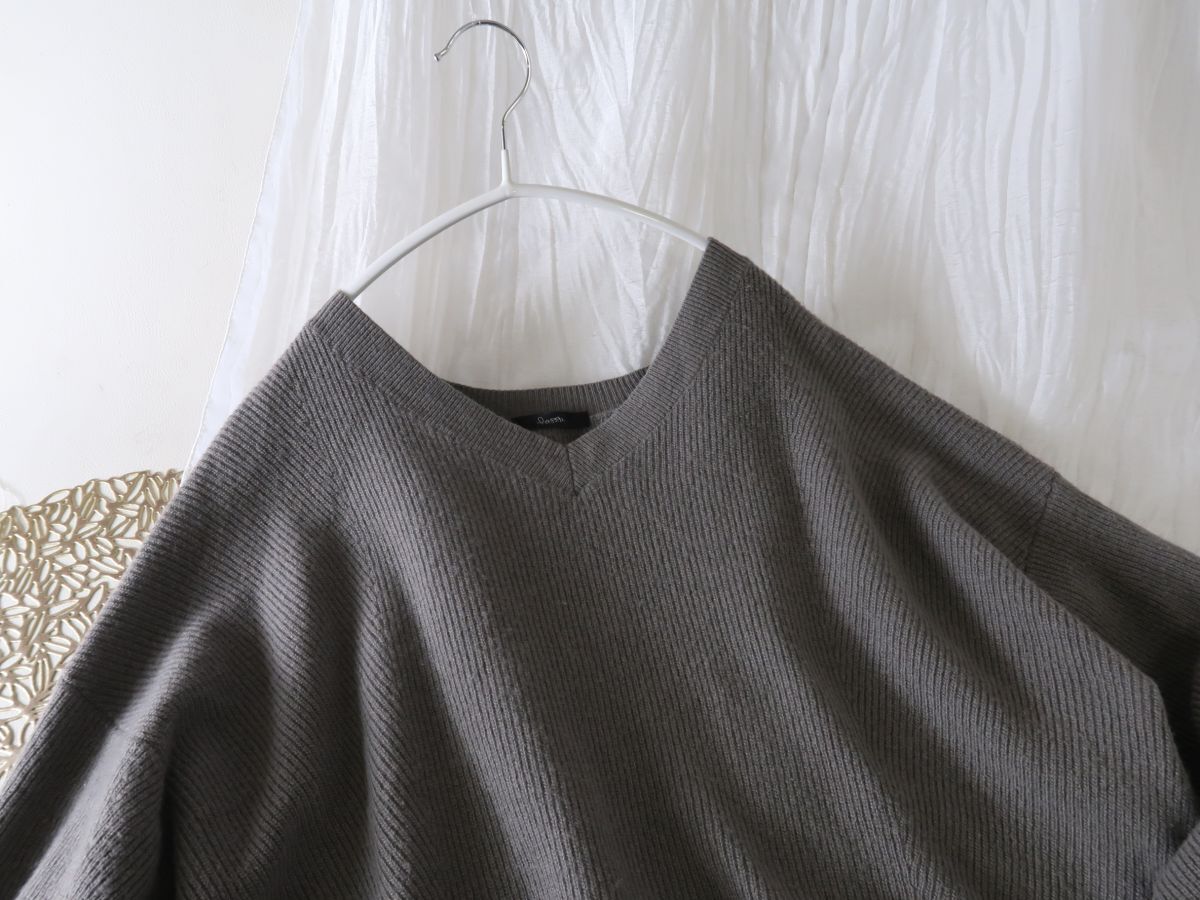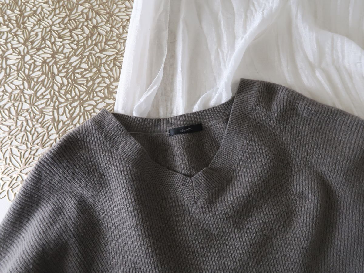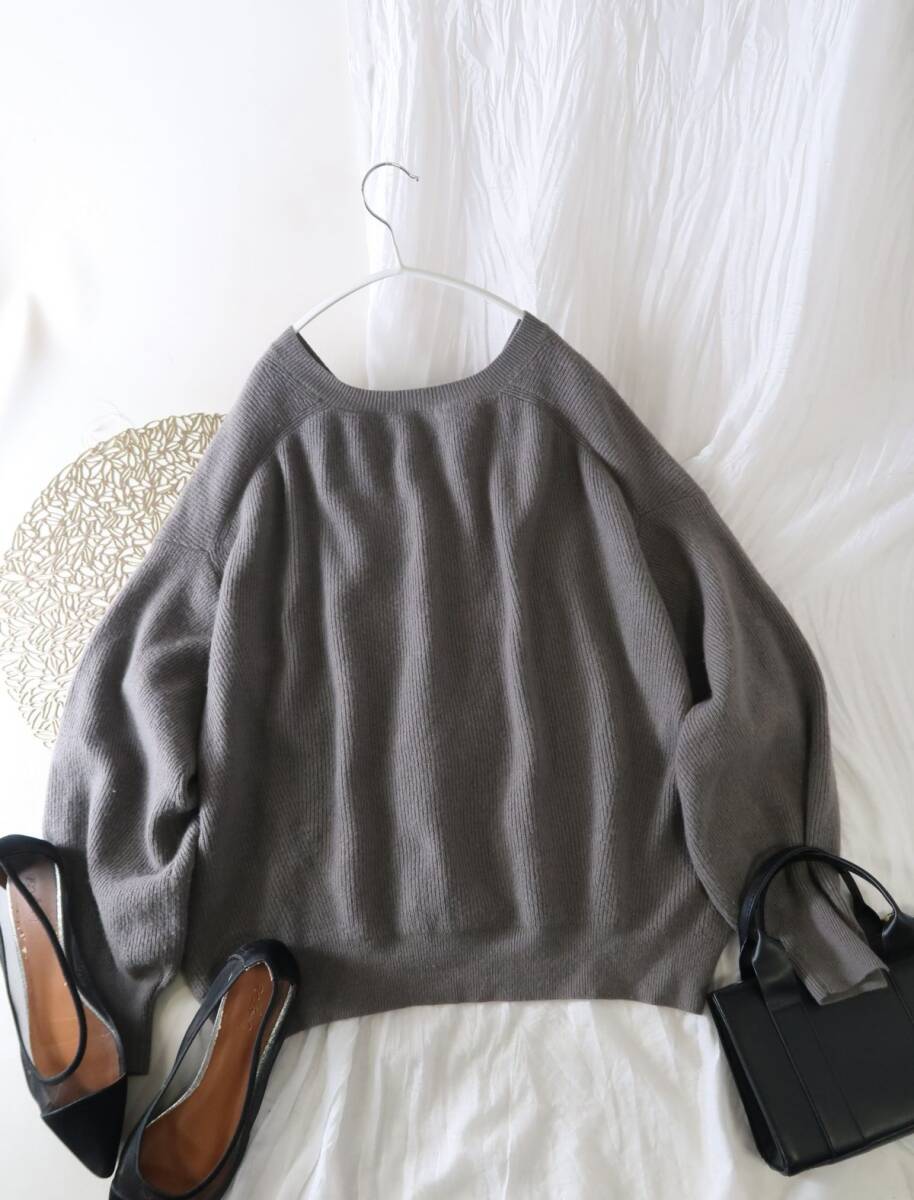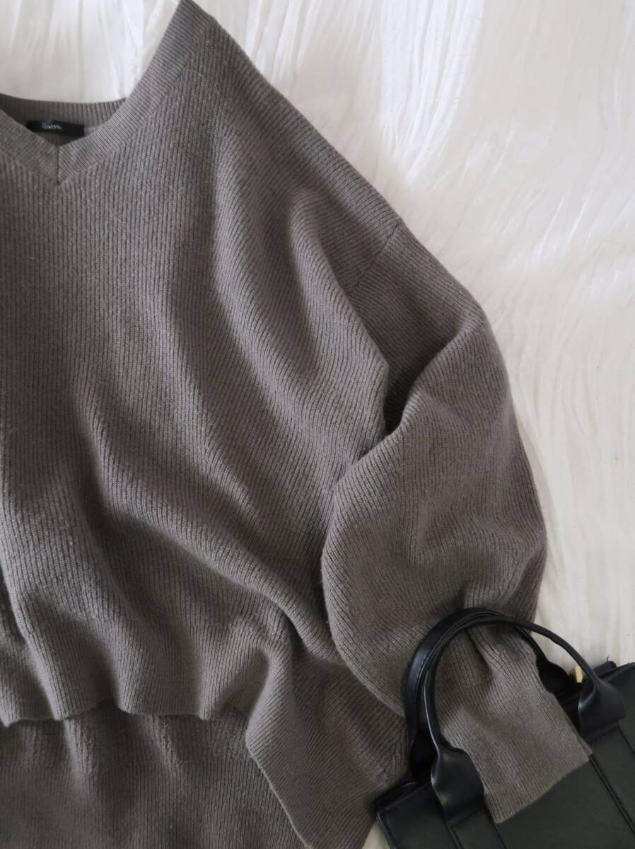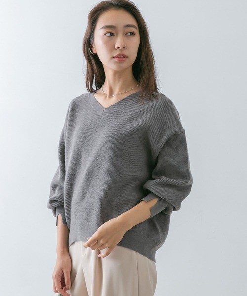 ふわっとボリュームの出る素材が魅力のニット。襟元のVネックで女性らしい抜け感をプラスします。