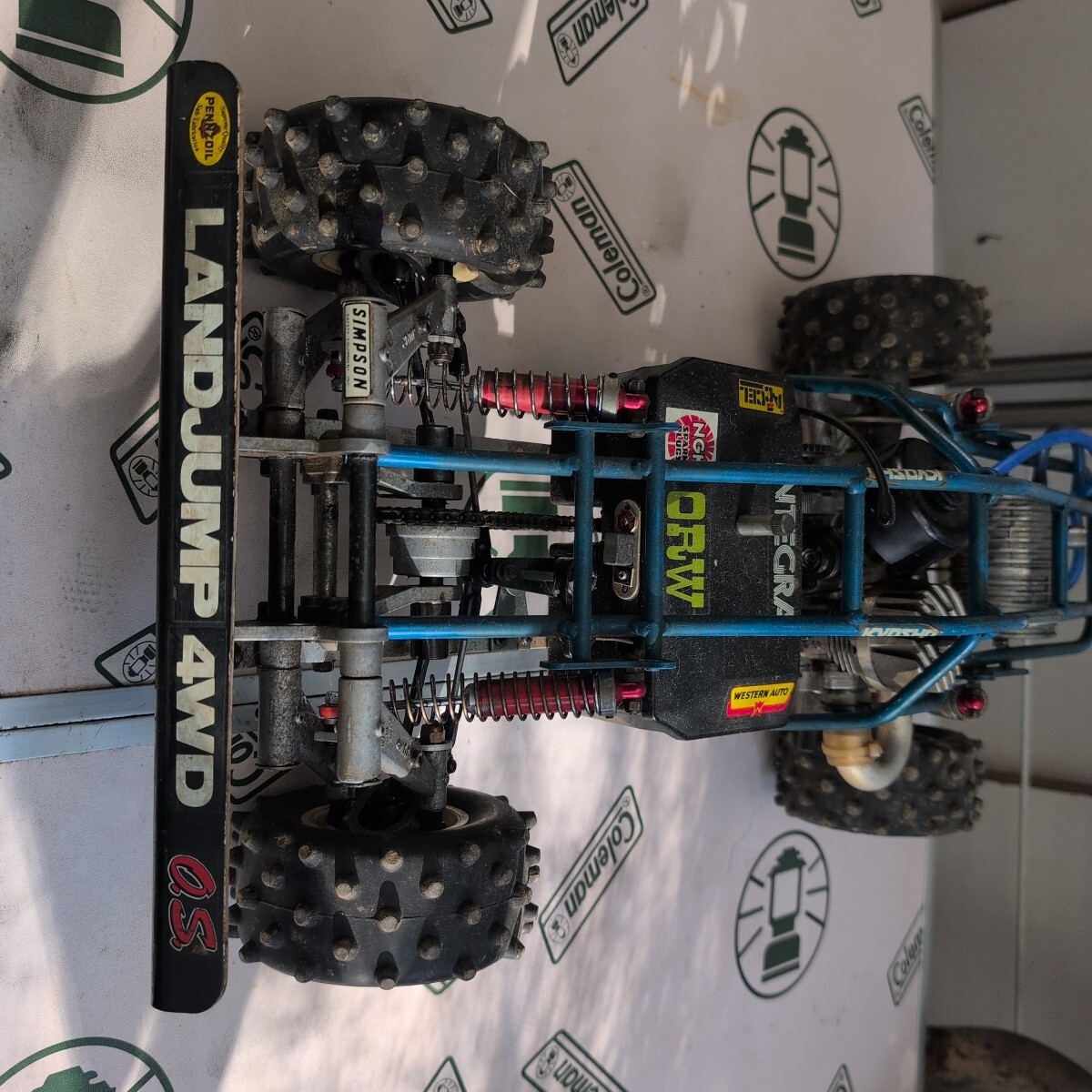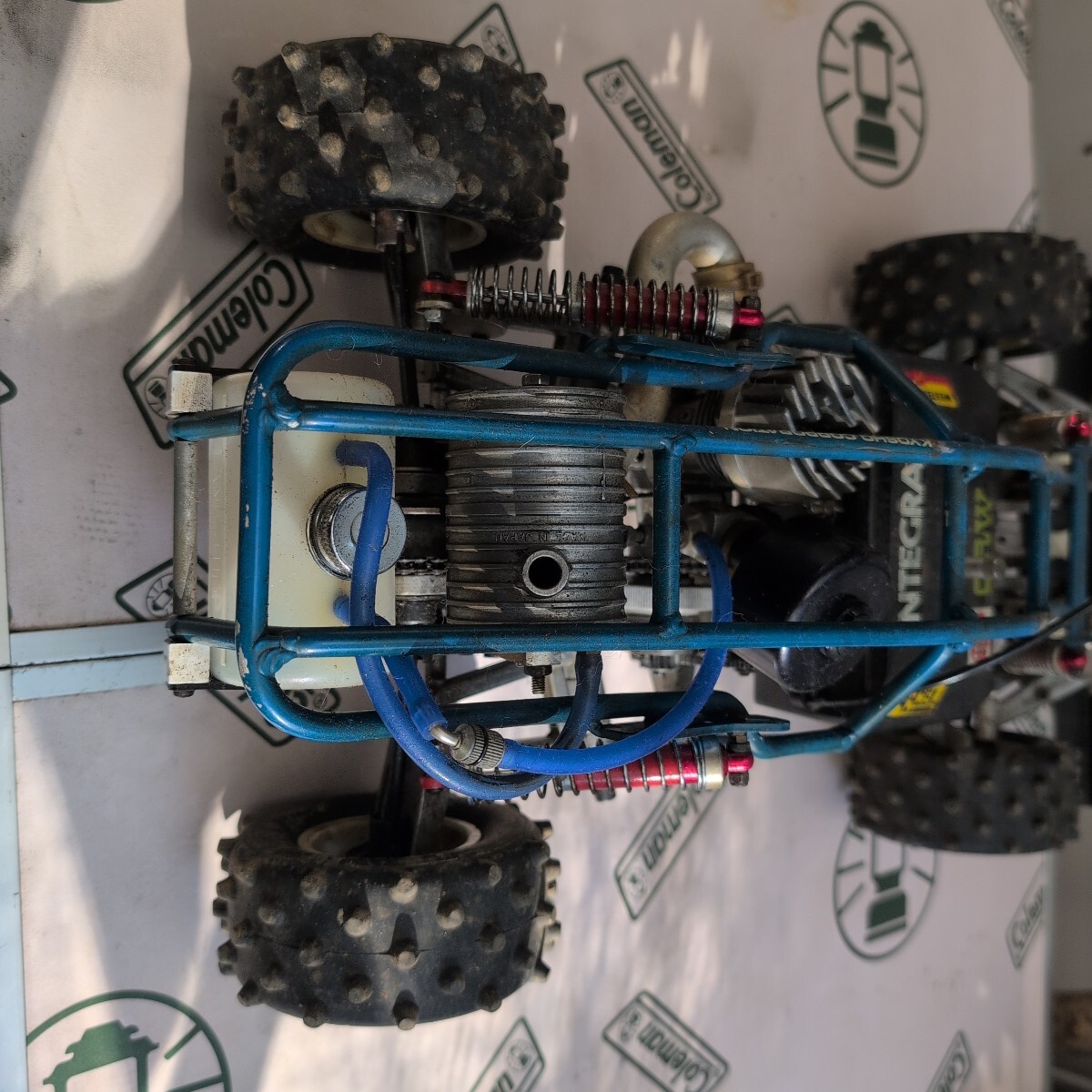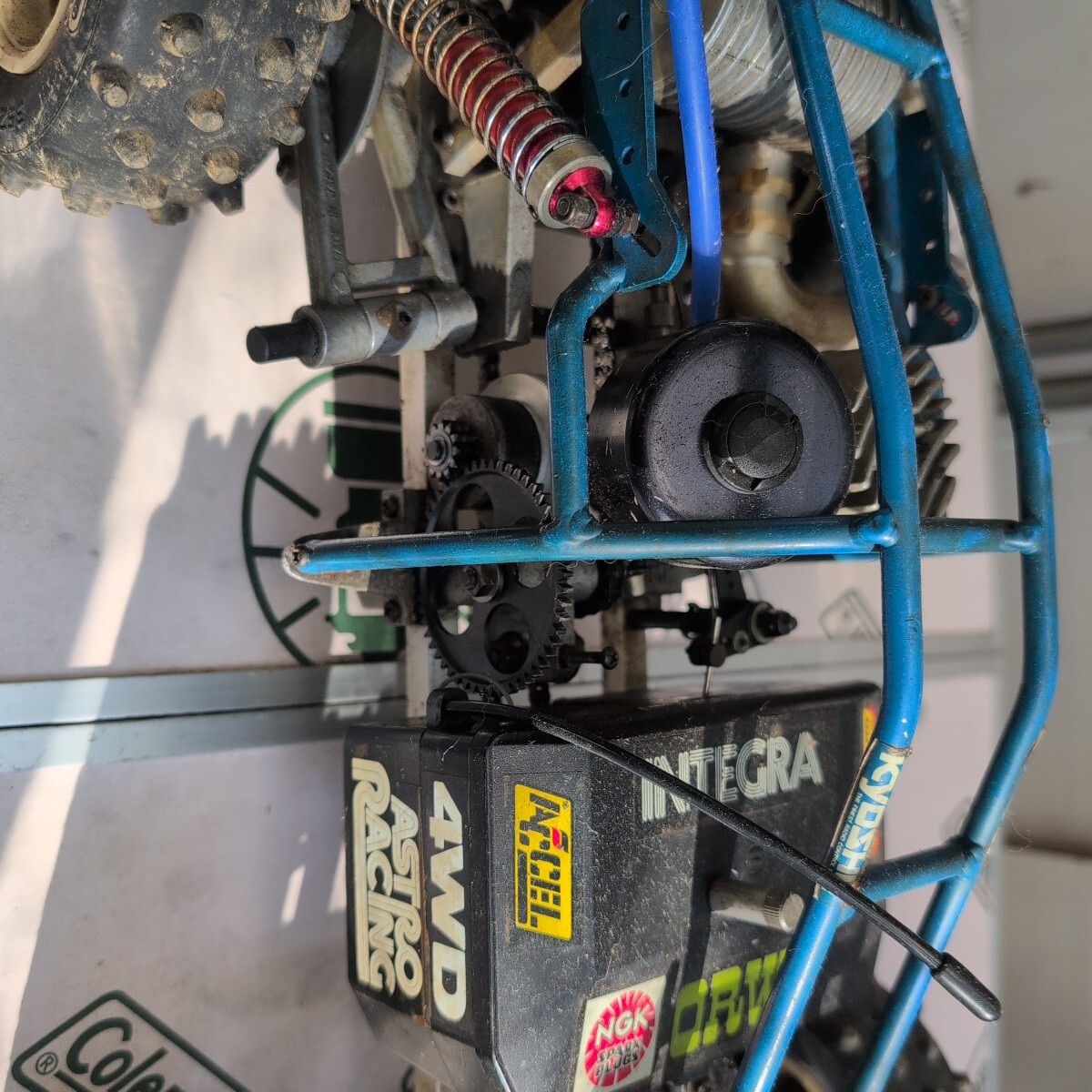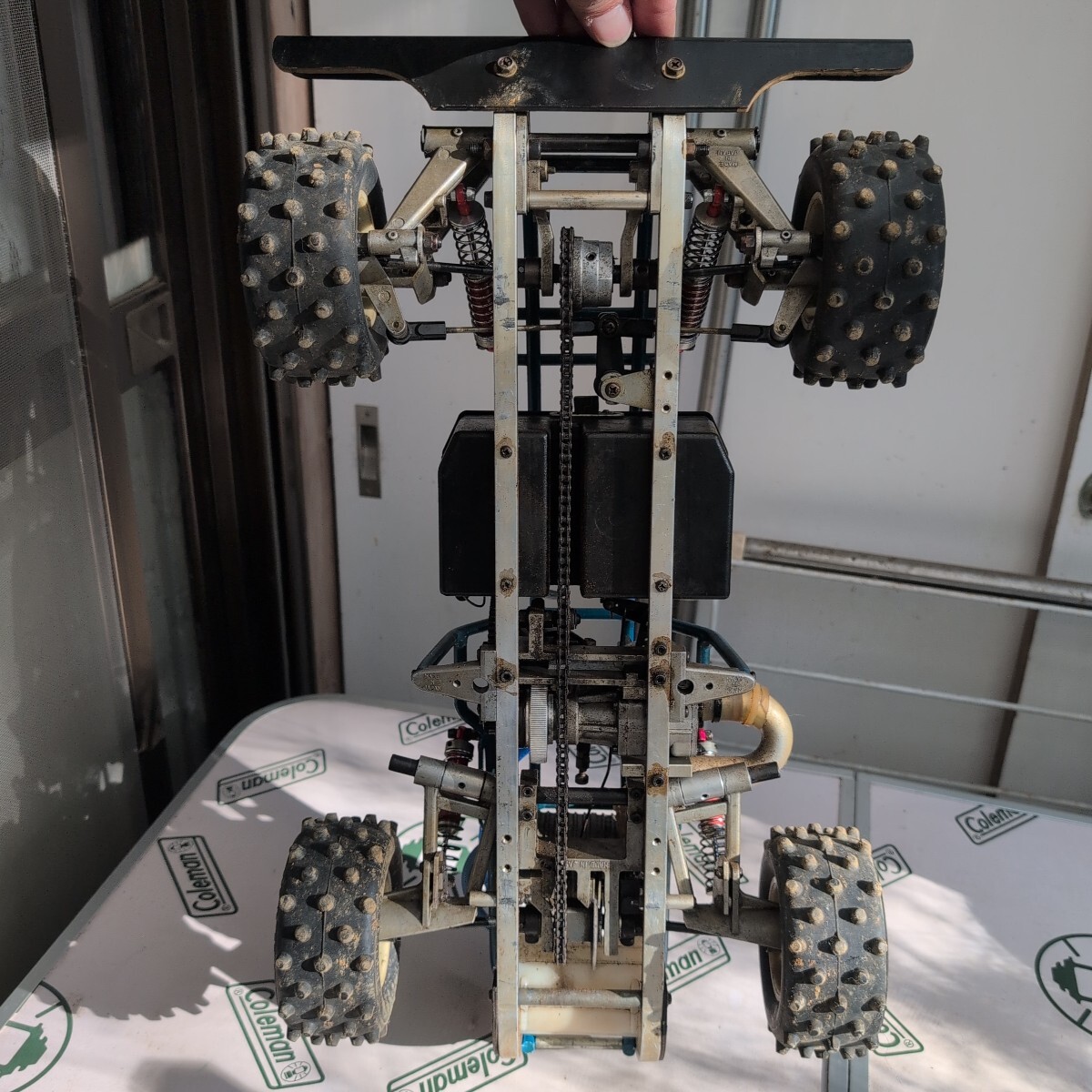 出品前にエンジン(OS MAX21VF)をバラして清掃し庭を軽く走行させております。タイヤは固くなっておりますがヒビ割れや欠けはありません。クラッチベル内のインナーが経年劣化で傷んでおり温かくなってくると膨張して半クラに近い状態になります。ダンパーはスプリングに錆が出ております。