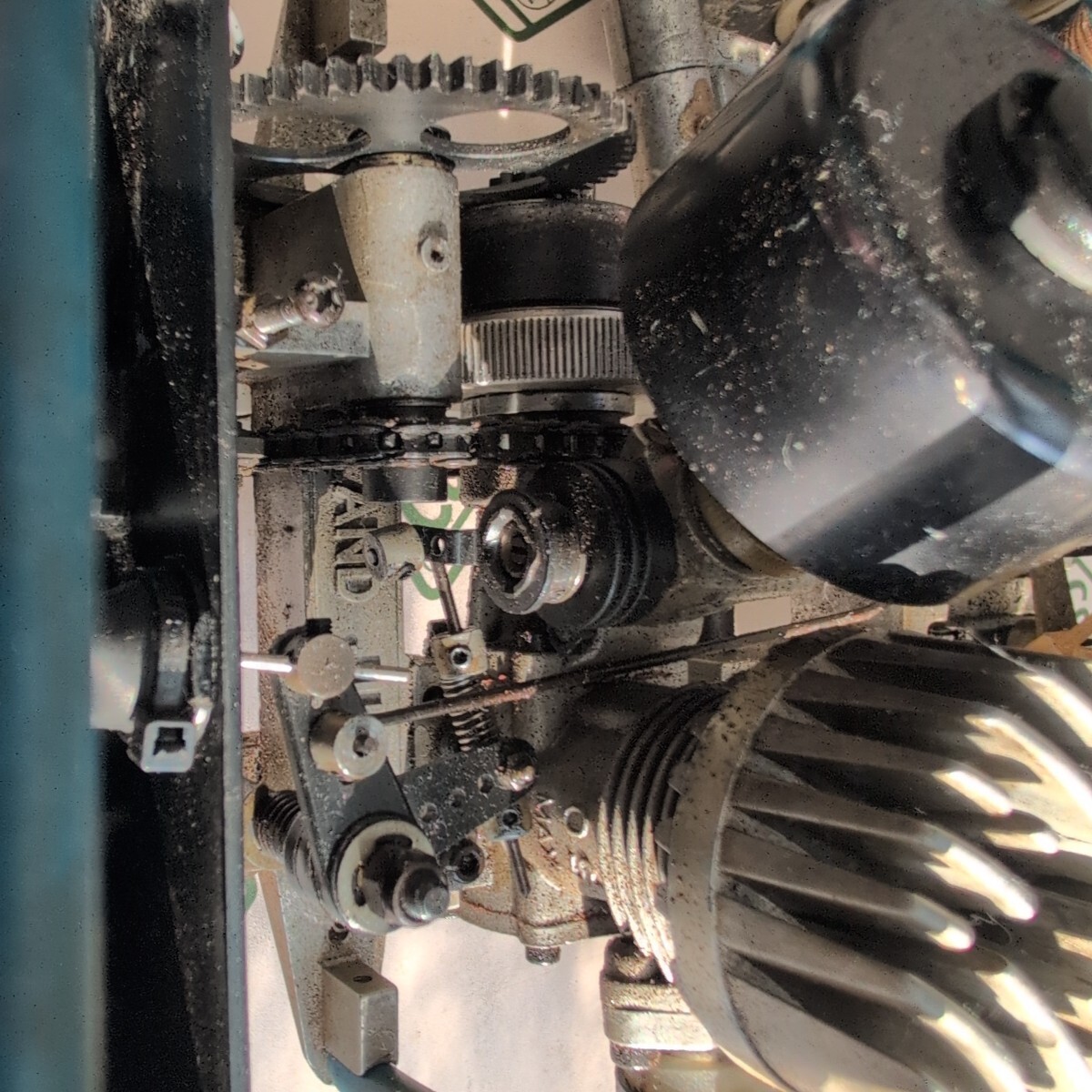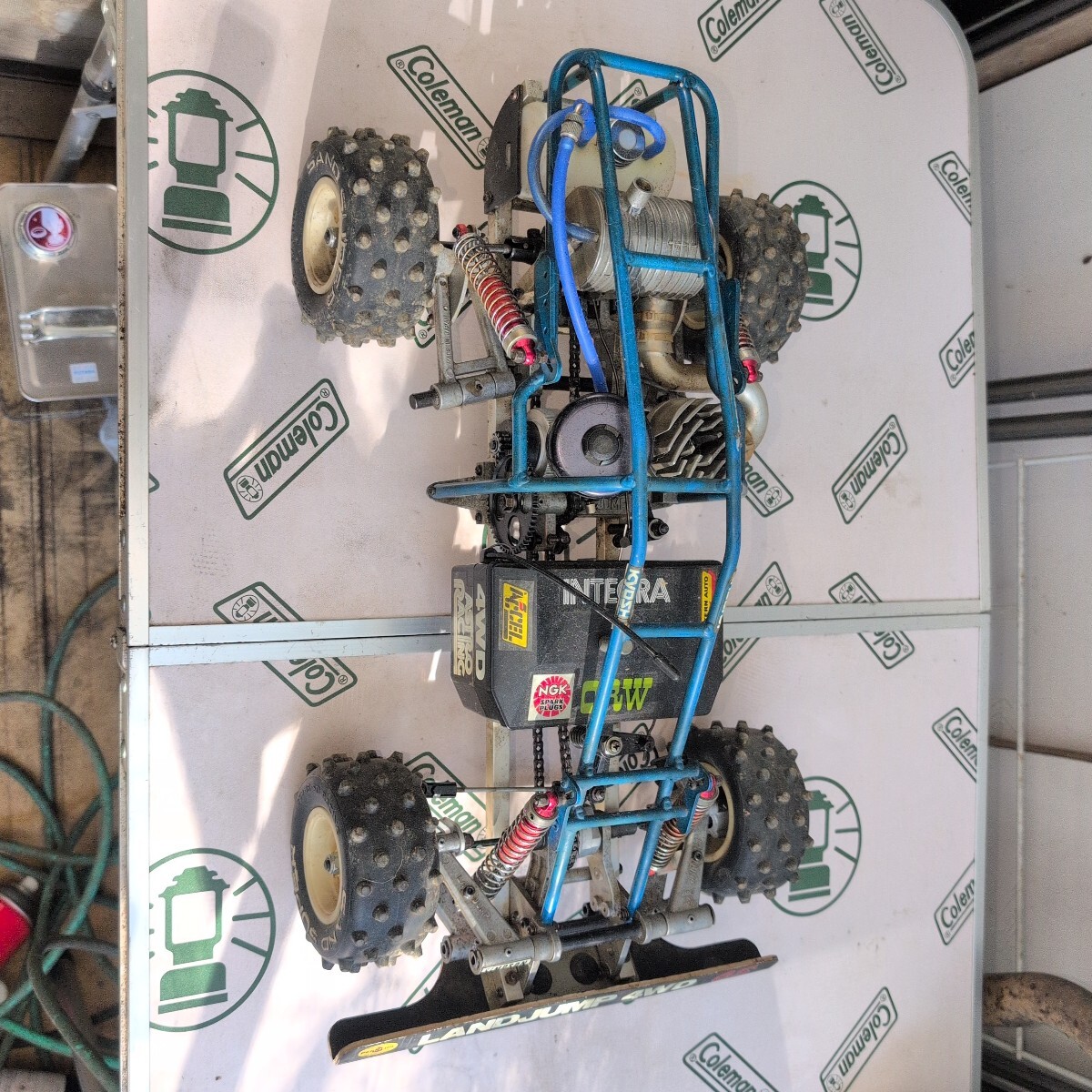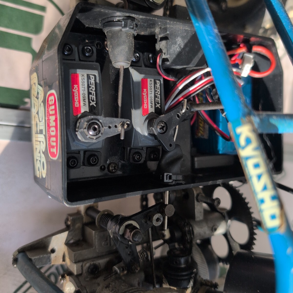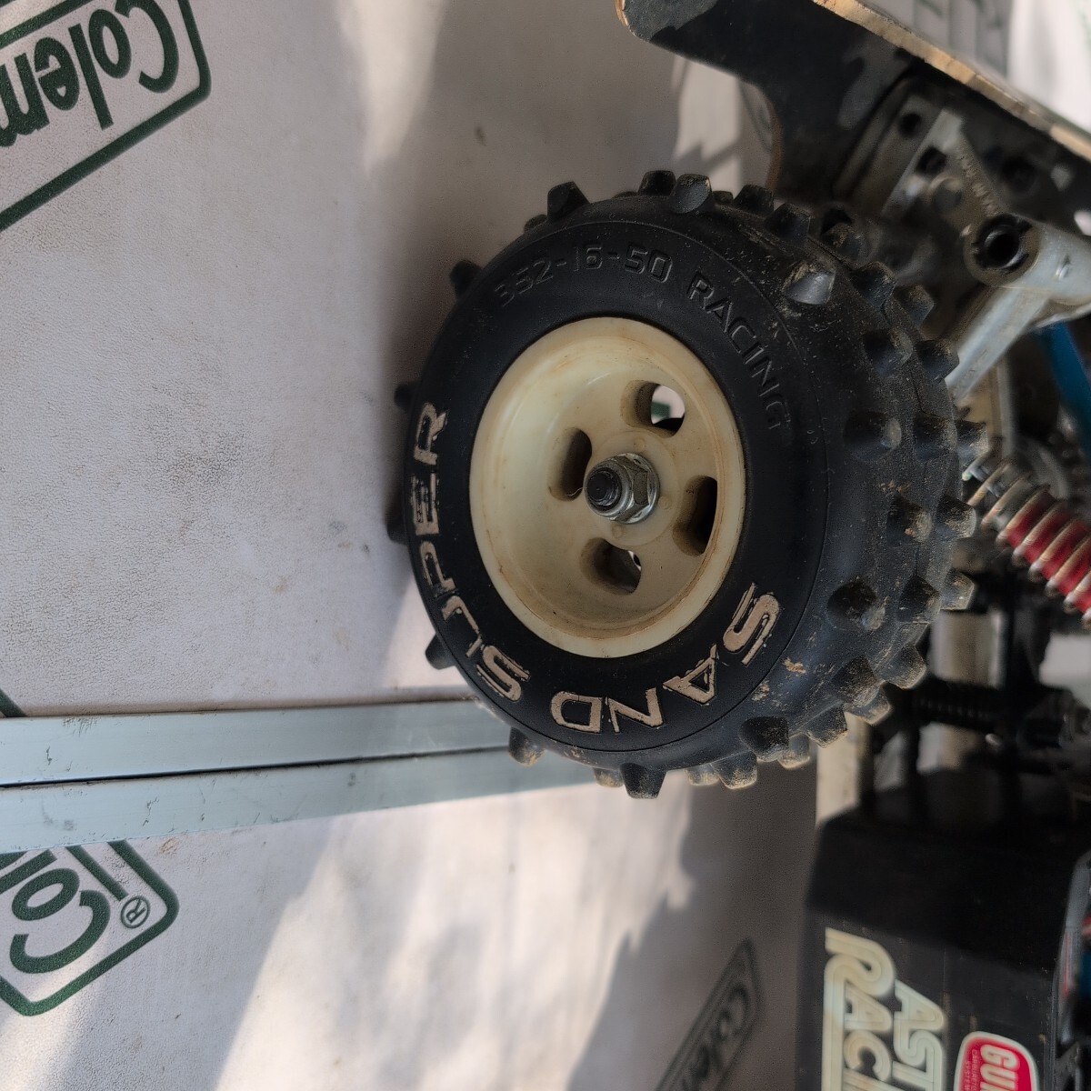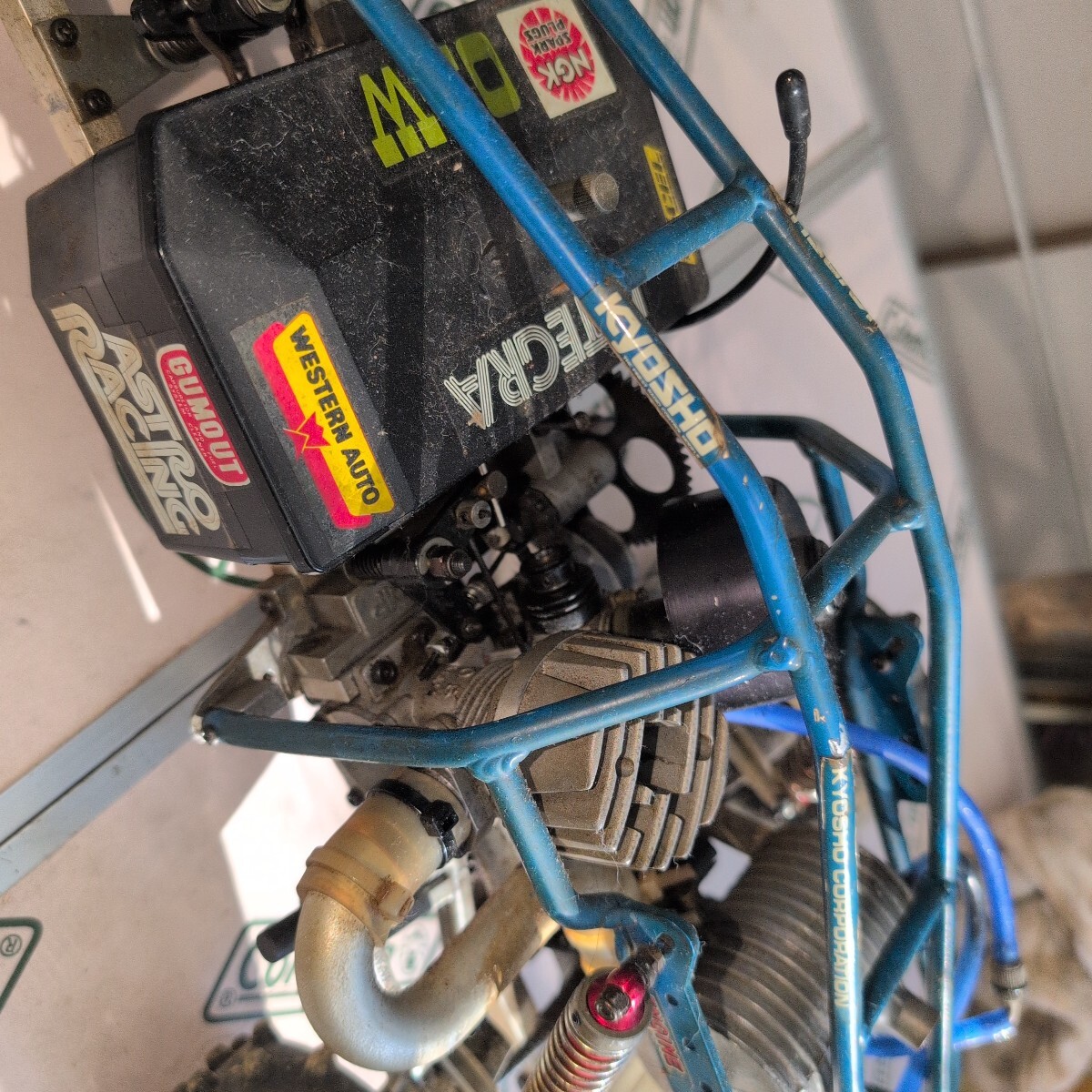 出品前にエンジン(OS MAX21VF)をバラして清掃し庭を軽く走行させております。タイヤは固くなっておりますがヒビ割れや欠けはありません。クラッチベル内のインナーが経年劣化で傷んでおり温かくなってくると膨張して半クラに近い状態になります。ダンパーはスプリングに錆が出ております。