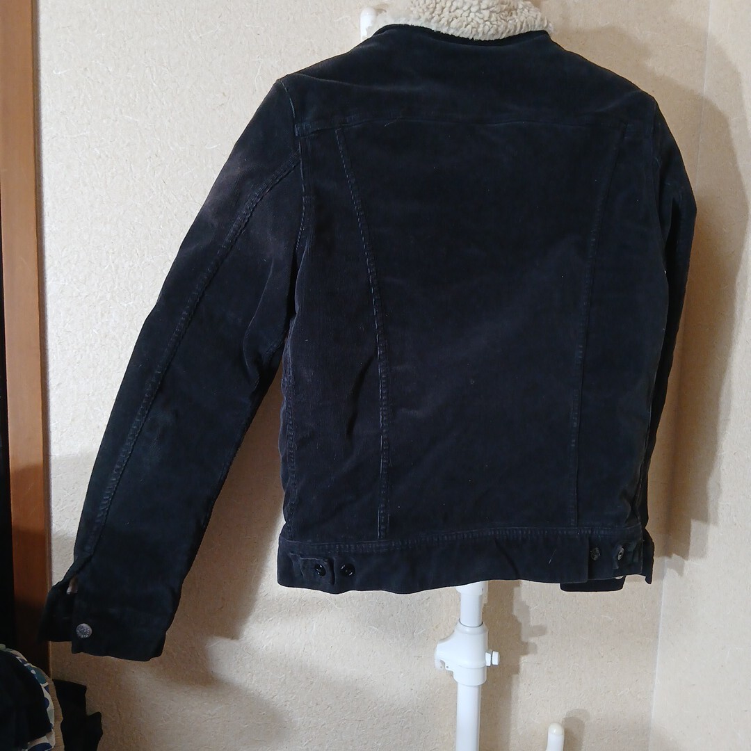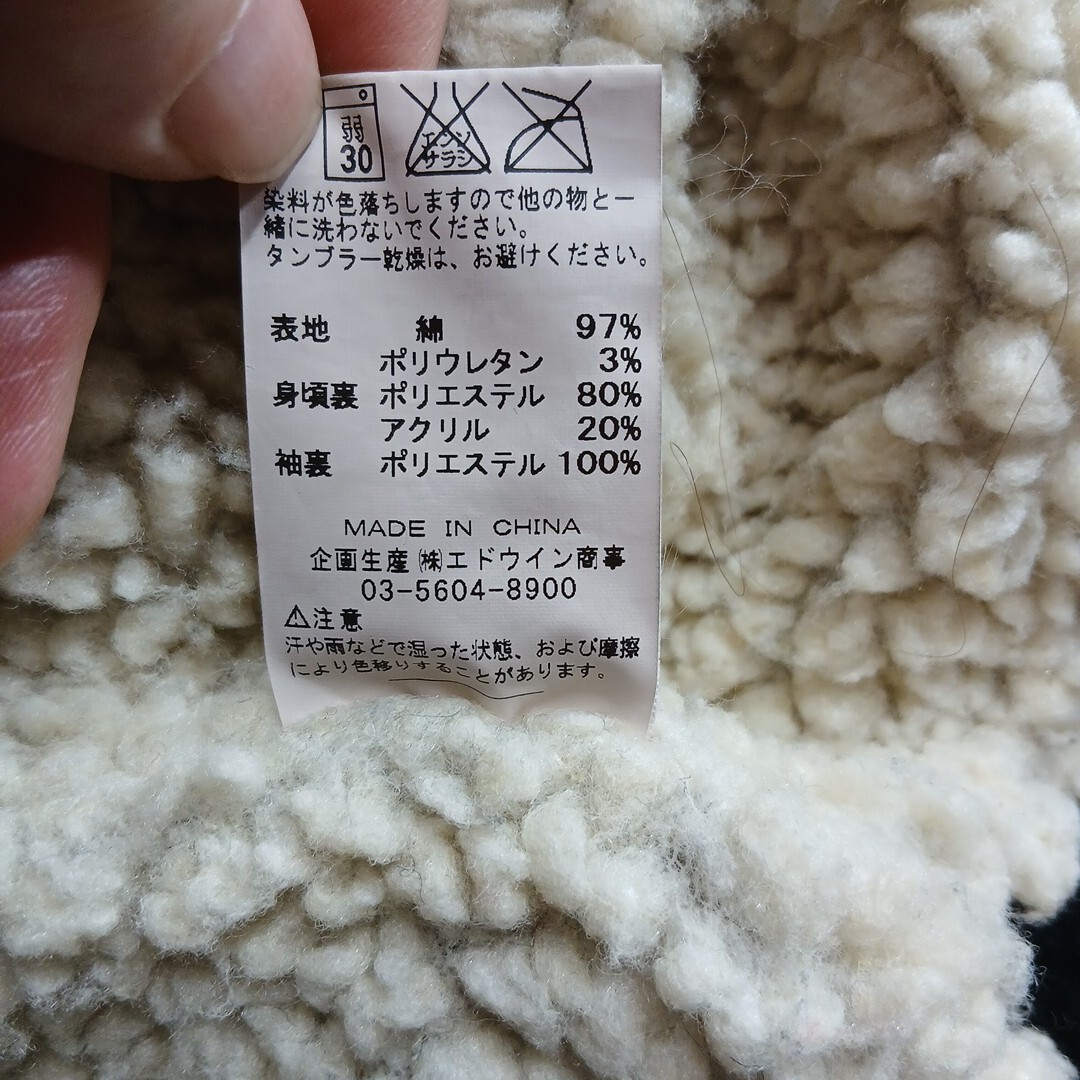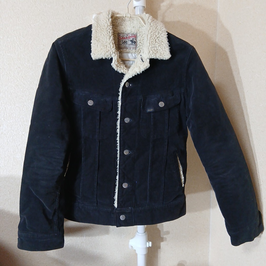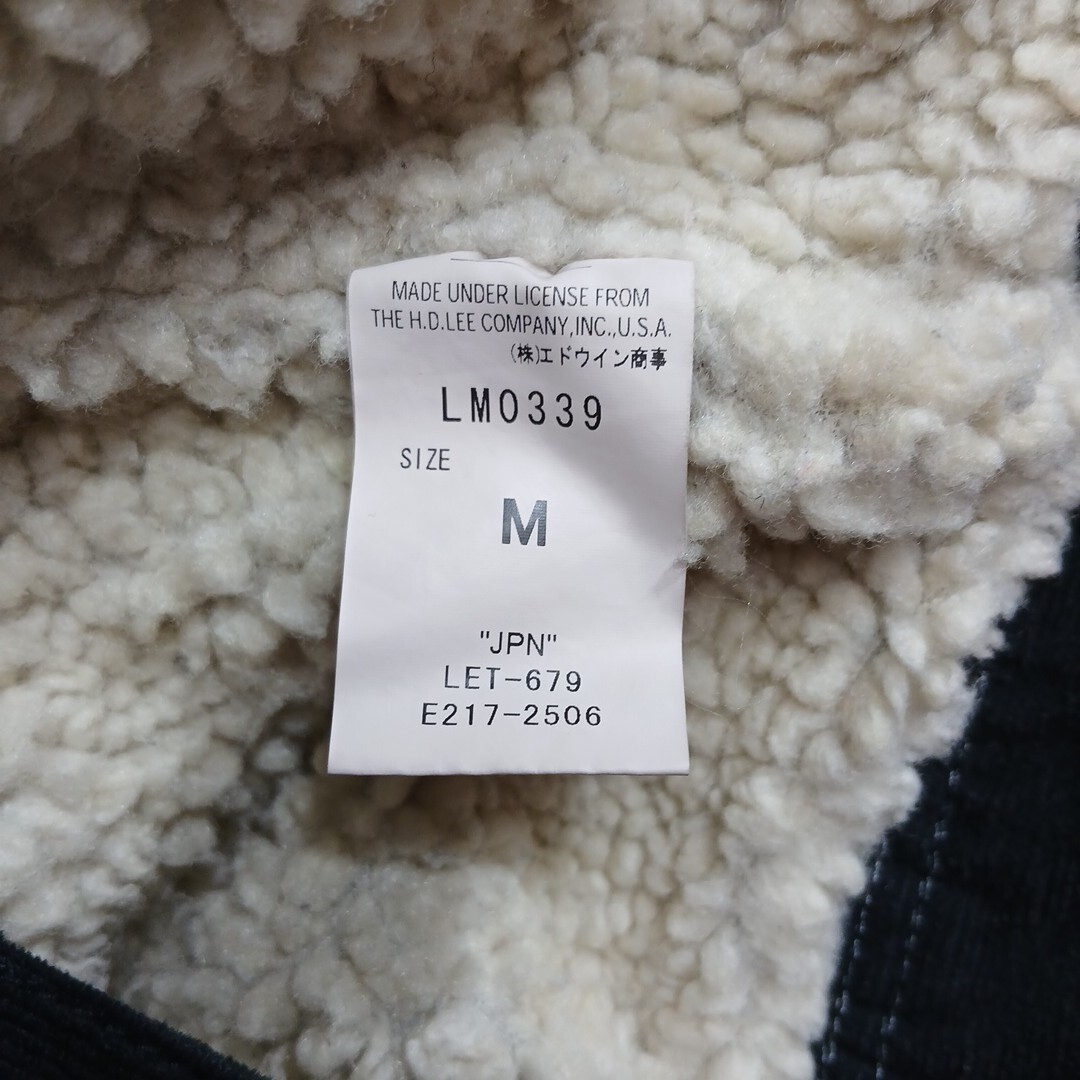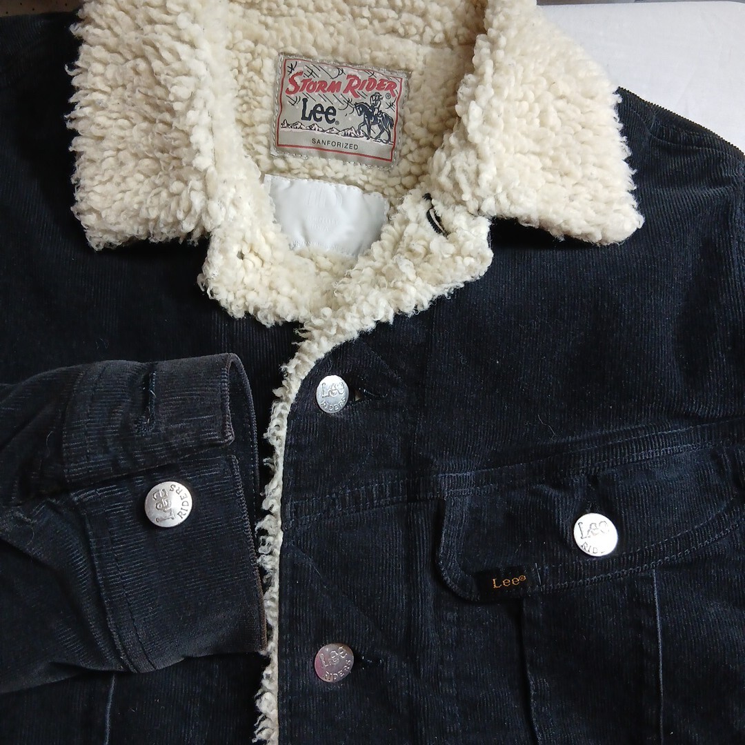 リー×ID(エドウィン)のストームライダーです。サイズはMで、実寸でおおよそ肩幅38センチ、身幅47センチ、着丈58センチ、袖丈62センチです。素材は、表地が綿97%、ポリウレタン3%で、身頃裏がポリエステル80%、アクリル20%で、袖裏がポリエステル100%です。表地はコーデュロイです。色は、黒色です。使用感、日焼けなどございますが特に目立つキズや汚れは無いと思います。