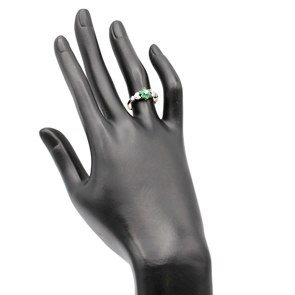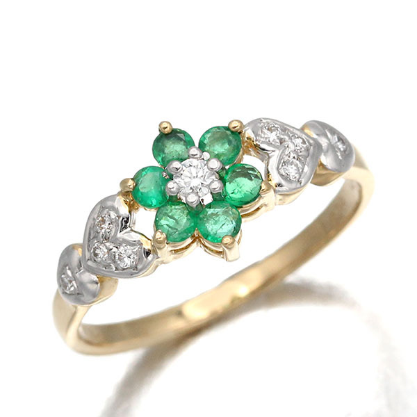 エメラルドの深いグリーンとダイヤモンドの輝きで花をかたどった、上品で華やかなフラワーモチーフリングです。