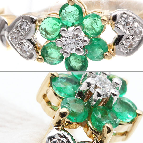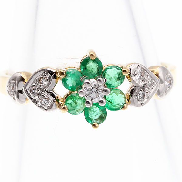 K18YG フラワーモチーフ エメラルド ダイヤモンド リング 12号 ゴールド 2.6g 指輪 ジュエリー 女性 レディース 誕生日 プレゼント
