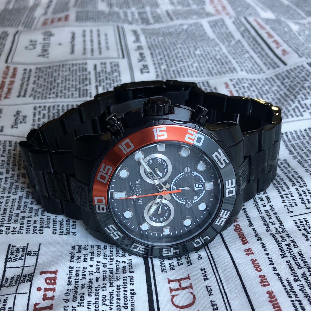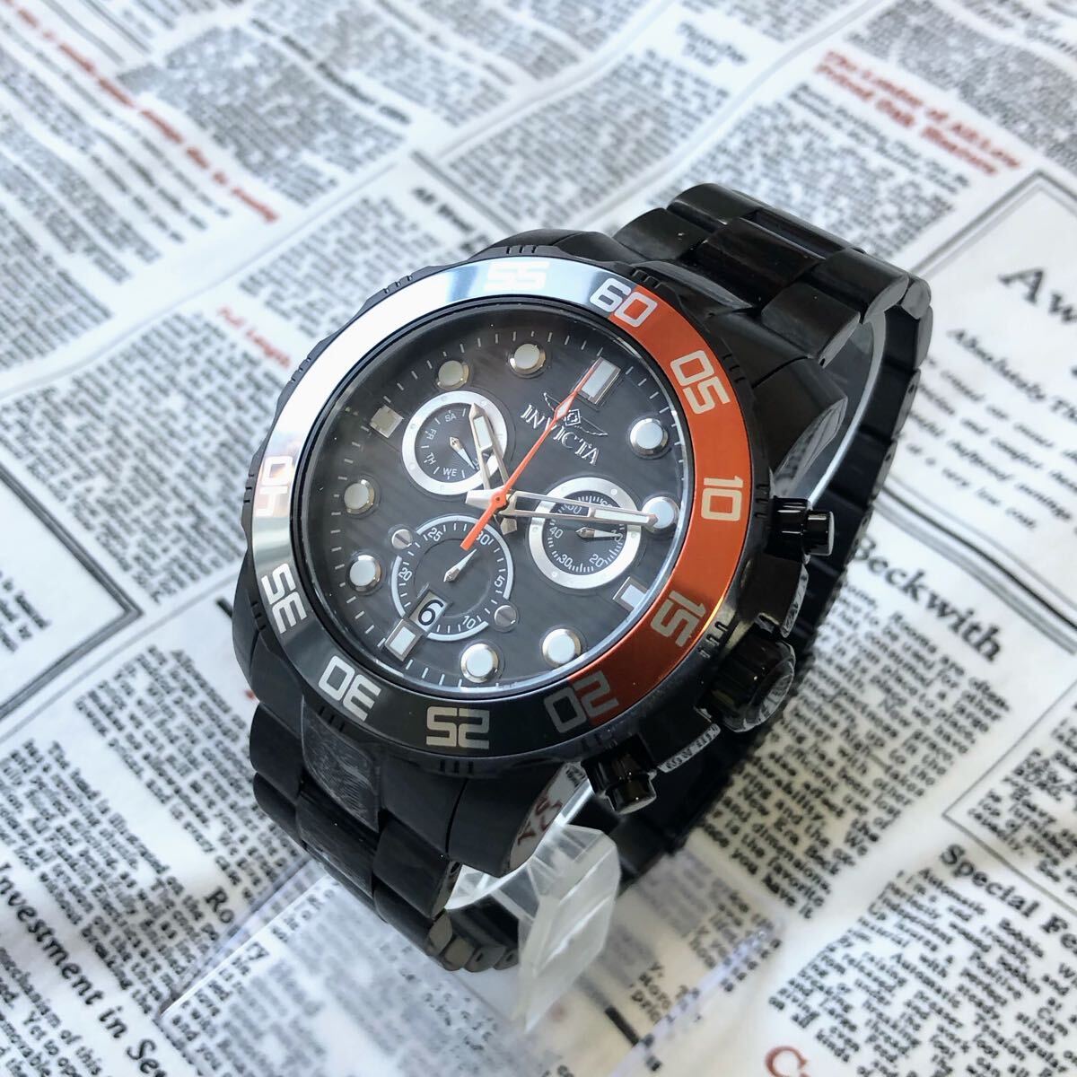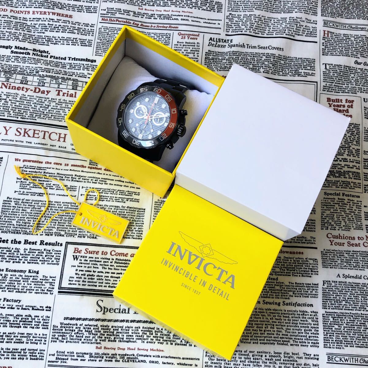 #3826【お洒落で高級】メンズ 腕時計 インビクタ Invicta クォーツ Quartz 動作良好 黒文字盤 インヴィクタ クロノグラフ 防水 黒赤ベゼル