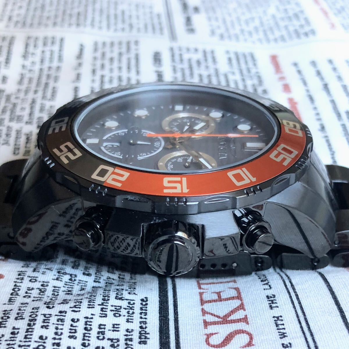 黒赤のベゼルとブラックフェイス、ブラックのベルトのマッチングは超カッコいいです。 クロノグラフ+カレンダーの機能も付いていてお勧めです!