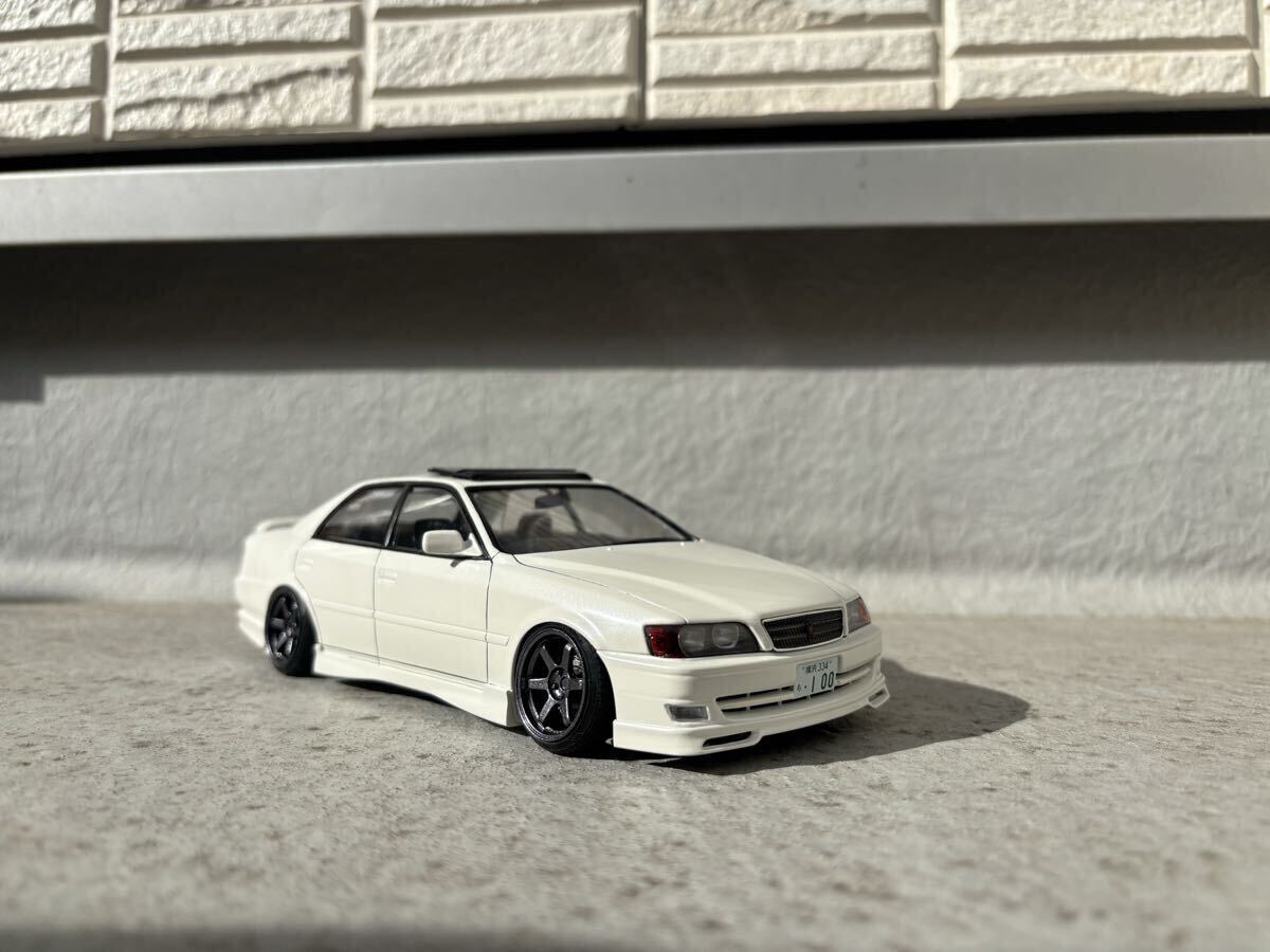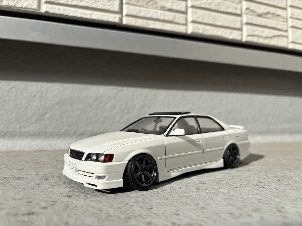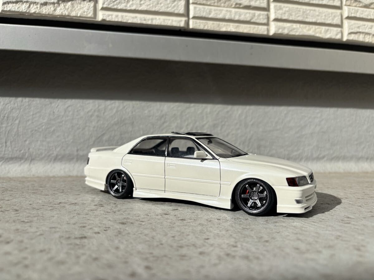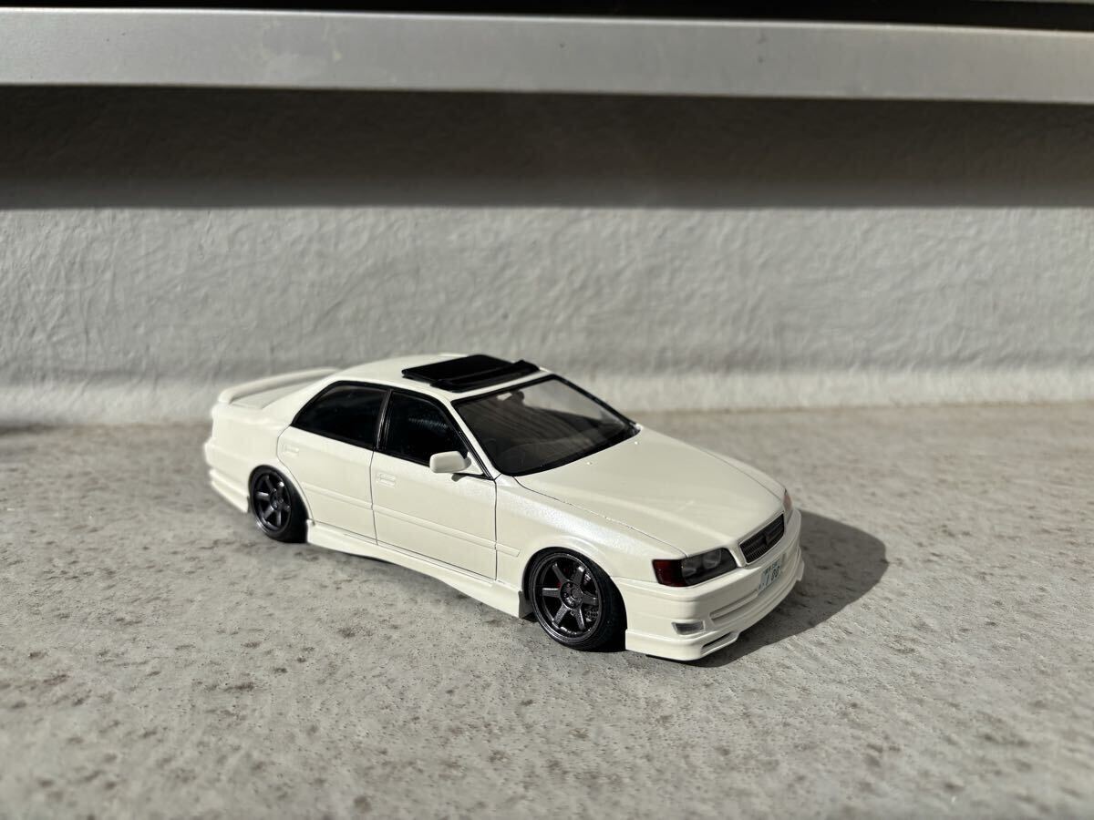 アオシマ製、JZX100 チェイサー ツアラーV 後期の完成品です。ボディカラーはパールホワイトです。クリヤー後にコンパウンドで磨いて実車用ワックスにて仕上げています。外装は純正風フルエアロ、自作にてサンルーフを開口してルーフバイザーを取り付けています。チルト状態で固定です。ホイールはボルクレーシング TE37RTの18インチを塗装して履かせています。タイヤは引っ張りタイヤです。自作にて車高を落としている為、多少の舵取り可能ですが回転不可です。素人作品の為、完璧ではありませんのでノークレーム・ノーリターンでお願いします。発送はゆうパック着払いのみとさせていただきます。また、発送中に部品等が外れてしまった場合は恐れ入りますが落札者様にて修理をお願いします。支払いはかんたん決済のみとさせて頂きます。尚、評価の悪い方、新規の方はいたずら入札防止の為、削除させて頂きます。 完成品を多数出品していますので是非そちらもご覧ください。