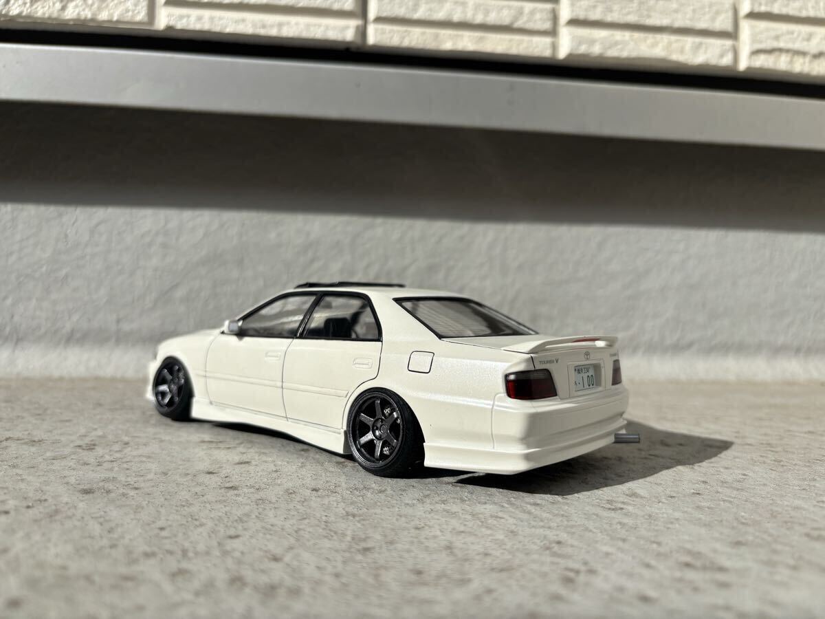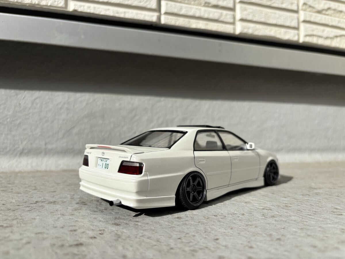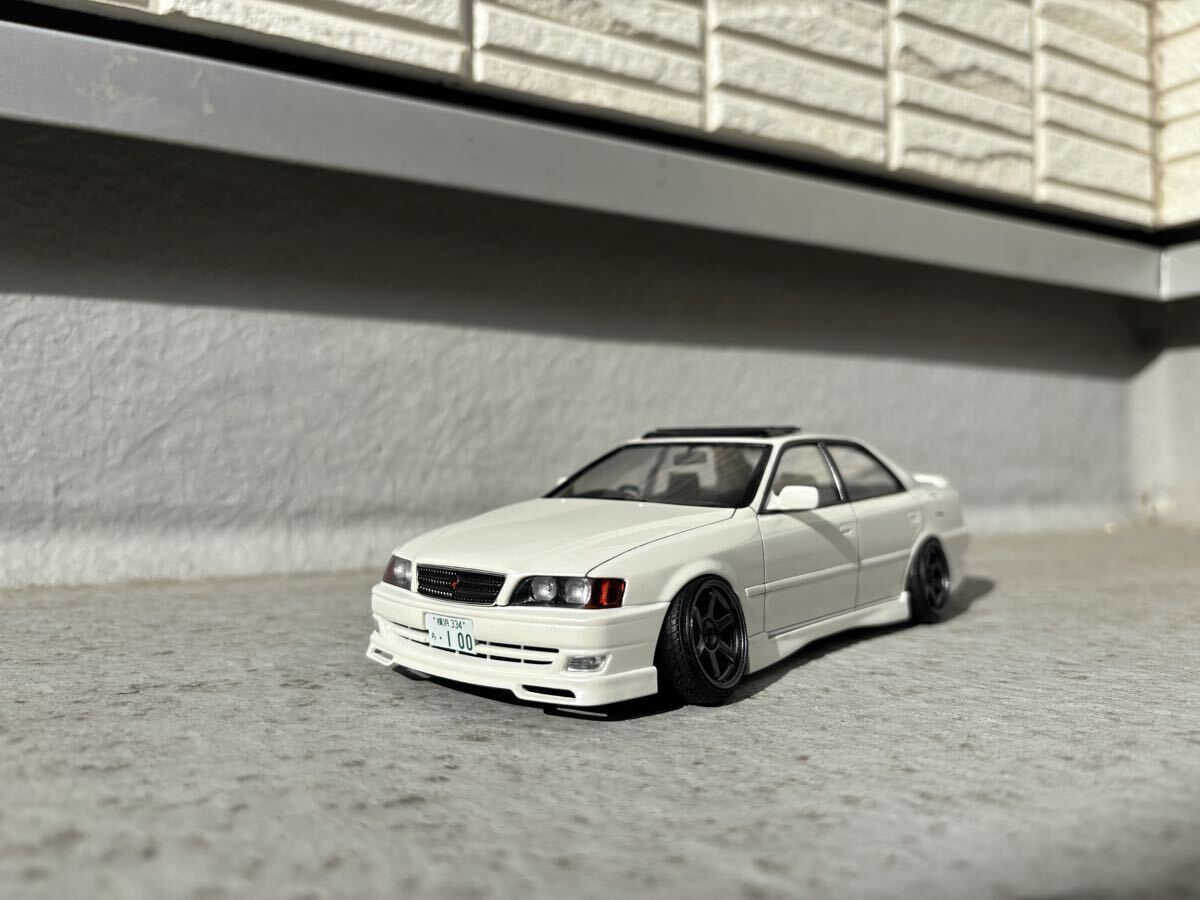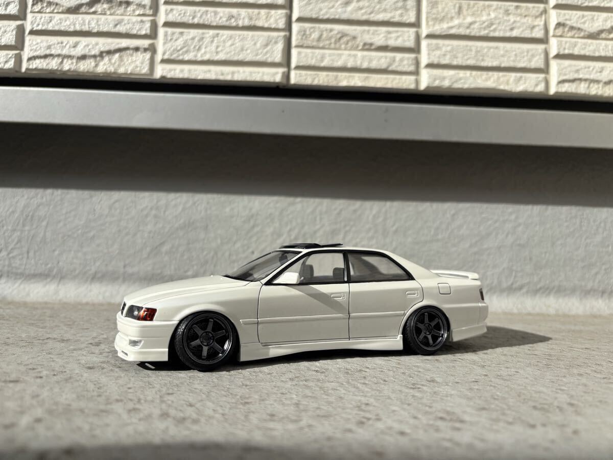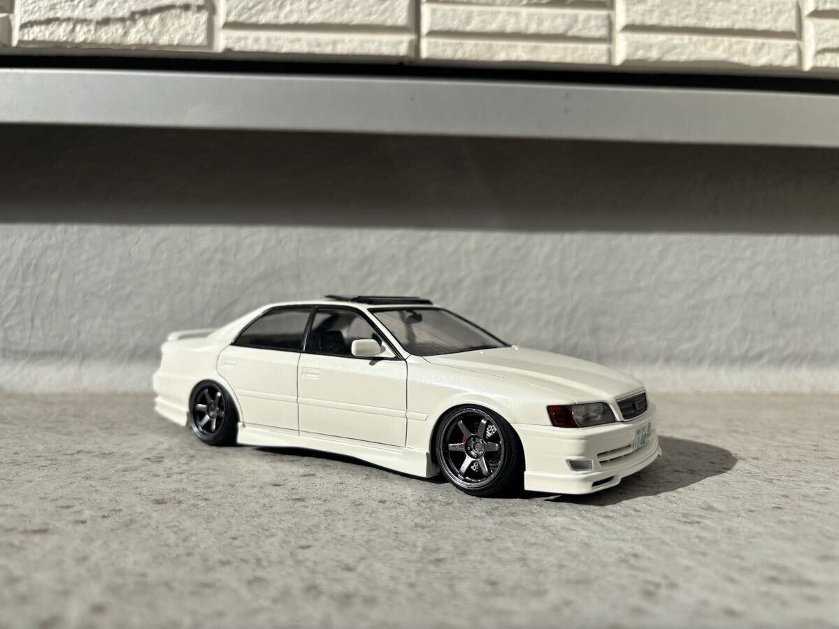 アオシマ製、JZX100 チェイサー ツアラーV 後期の完成品です。ボディカラーはパールホワイトです。クリヤー後にコンパウンドで磨いて実車用ワックスにて仕上げています。外装は純正風フルエアロ、自作にてサンルーフを開口してルーフバイザーを取り付けています。チルト状態で固定です。ホイールはボルクレーシング TE37RTの18インチを塗装して履かせています。タイヤは引っ張りタイヤです。自作にて車高を落としている為、多少の舵取り可能ですが回転不可です。素人作品の為、完璧ではありませんのでノークレーム・ノーリターンでお願いします。発送はゆうパック着払いのみとさせていただきます。また、発送中に部品等が外れてしまった場合は恐れ入りますが落札者様にて修理をお願いします。支払いはかんたん決済のみとさせて頂きます。尚、評価の悪い方、新規の方はいたずら入札防止の為、削除させて頂きます。 完成品を多数出品していますので是非そちらもご覧ください。