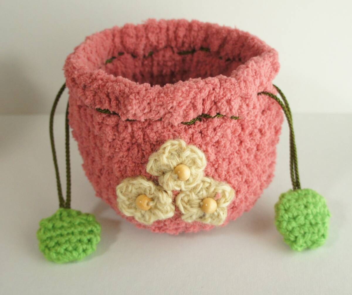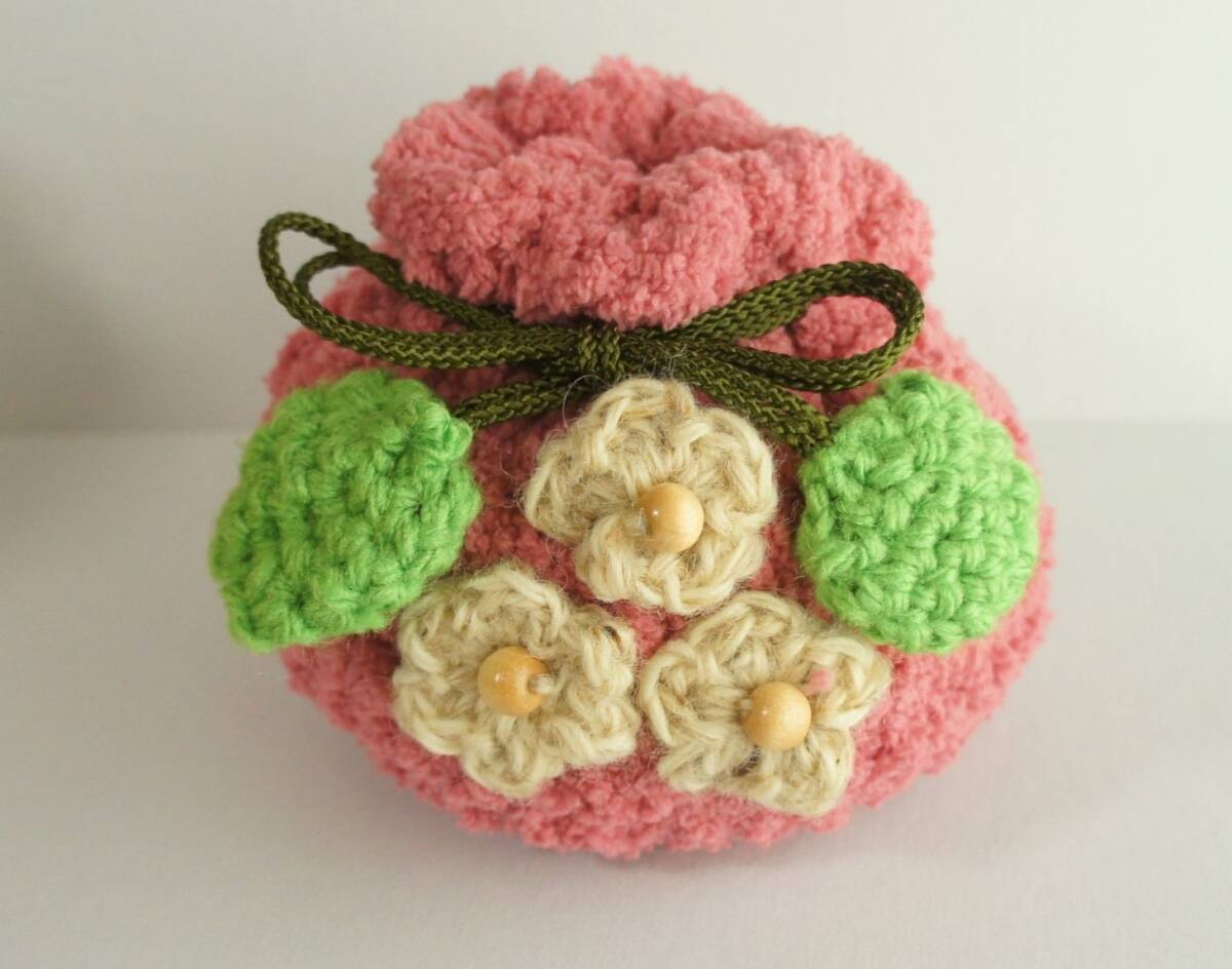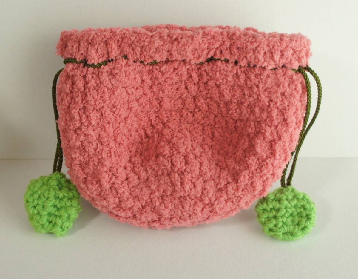 ハンドメイド  巾着  もも 桃  かぎ針編み 手編み モコモコ ウッドビーズ 江戸打ち紐