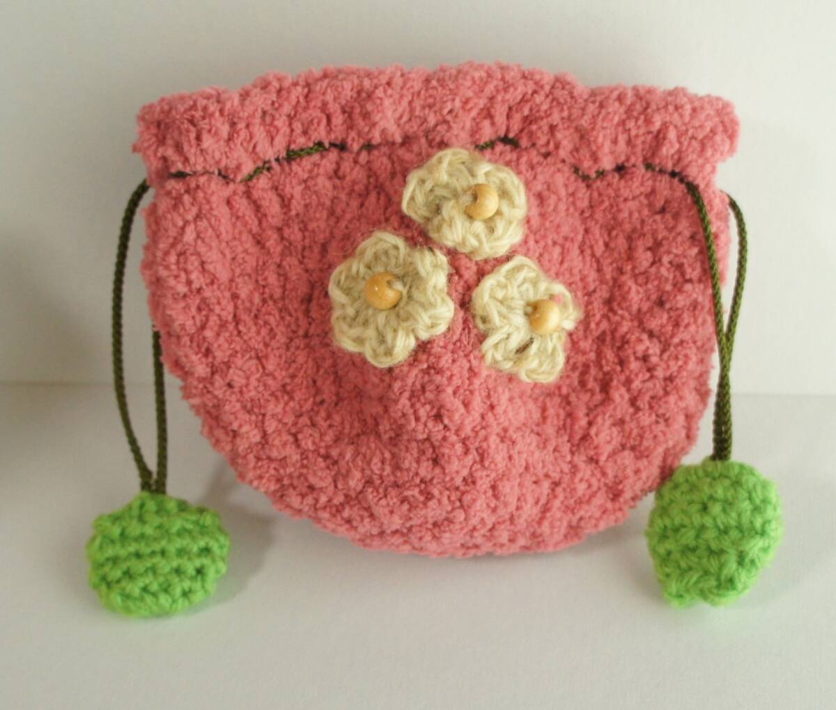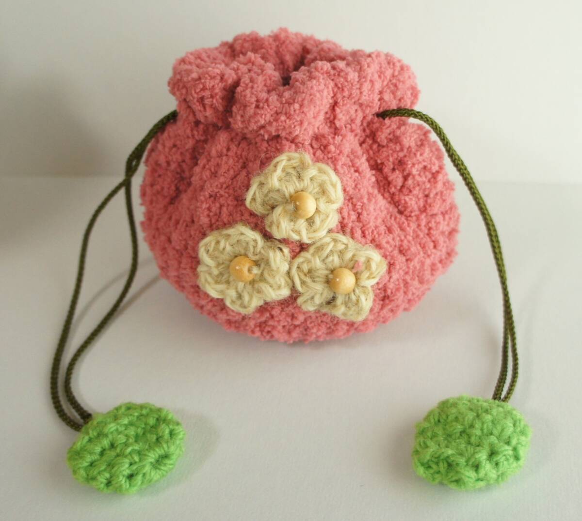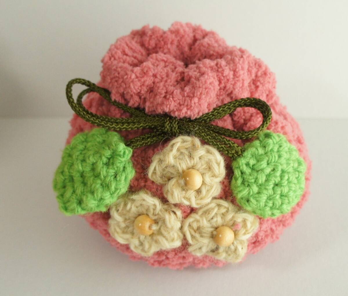 ハンドメイド  巾着  もも 桃  かぎ針編み 手編み モコモコ ウッドビーズ 江戸打ち紐