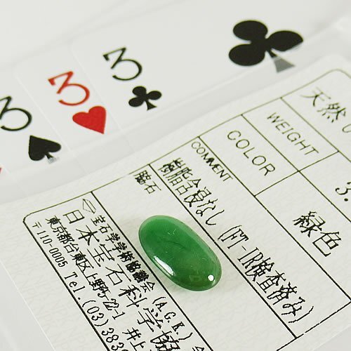 | 品名 /【SJ】新品 ヒスイ(ジェイダイト) 3.86ct ジュエリールース 材質 / 天然ヒスイ(ジェイダイト) 縦・横 / (約)13.8mm 7.7mm 厚さ / (約)4mm 総重量 / 3.86ct 日宝協ソーティング付き 【SJ】/ 新品製品 品番 / ACD674 参考小売価格 / 154,000円 |