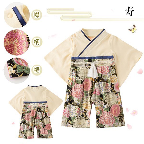 | ☆新柄!袴ロンパース ベビー服 オーダーフォームにサイズ、柄をご入力ください 70cm:青海波/さくら/寿/花束/夜桜/空海/花祭り 80cm:青海波/さくら/寿/花束/夜桜/空海/花祭り ※花祭り70/80 在庫切れ 【これでお姫様、お殿さま!かわいいベビー用袴ロンパースの登場!】 袴ロンパースとは、赤ちゃんの和装用として作られた袴デザインのロンパースのこと。 和服は「洗濯が大変!汚れたらどうしよう」「着つけなんてできない」というイメージを持たれることが多いのですが、袴ロンパースなら大丈夫! 洗濯しやすい素材と、着脱しやすいデザインで、赤ちゃんでも安心して着付け無しで着せてあげることが出来ます。 股下からボタンで開けられるのでお着替え簡単。 ■お食い初め ■ひな祭り ■お宮参り ■初節句 などなど写真撮影におすすめです。 着付け無しで簡単に着せてあげられるので、子育てライフを大いに手助けしてくれます。 【柄・タイプ】 ★男の子用★ ・青海波 ・寿 ・空海 ★女の子用★ ・花束 ・夜桜 ・さくら ・花祭り 【サイズ】 70: 総丈:約50cm 身幅:約26cm ゆき丈:約27cm 股下:約18cm 80: 総丈:約56cm 身幅:約27cm ゆき丈:約29cm 股下:約20cm 【素材】 コットン95%/ポリエステル5% キーワード ( 袴 ロンパース ベビー服 お正月 女の子 男の子 着物 フォーマル 赤ちゃん 初節句 お食い初め お宮参り 百日祝い 出産祝い ) | ||||