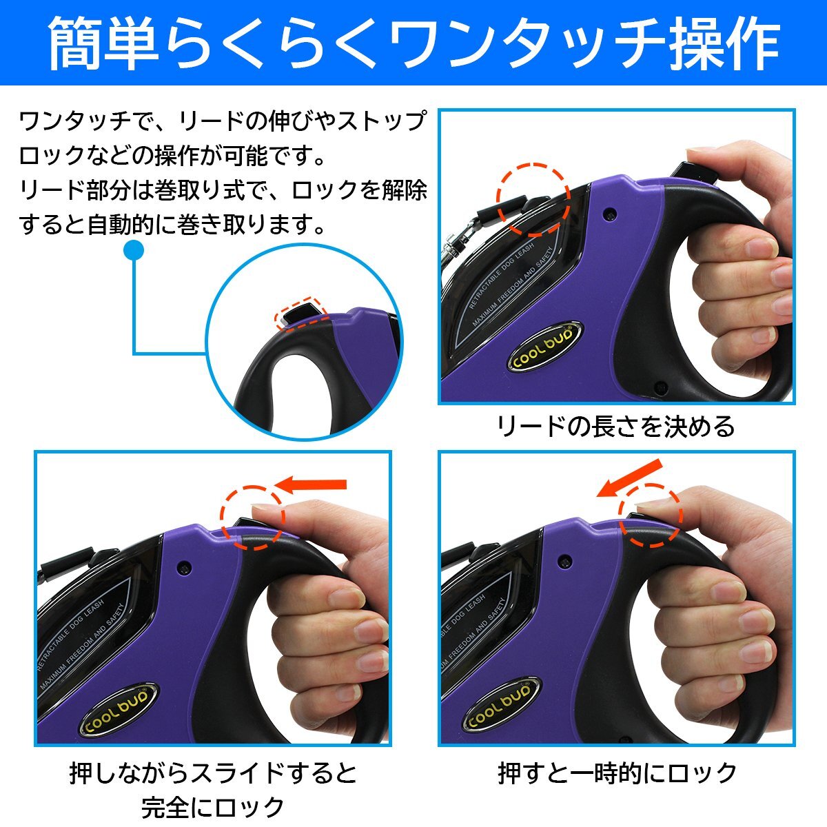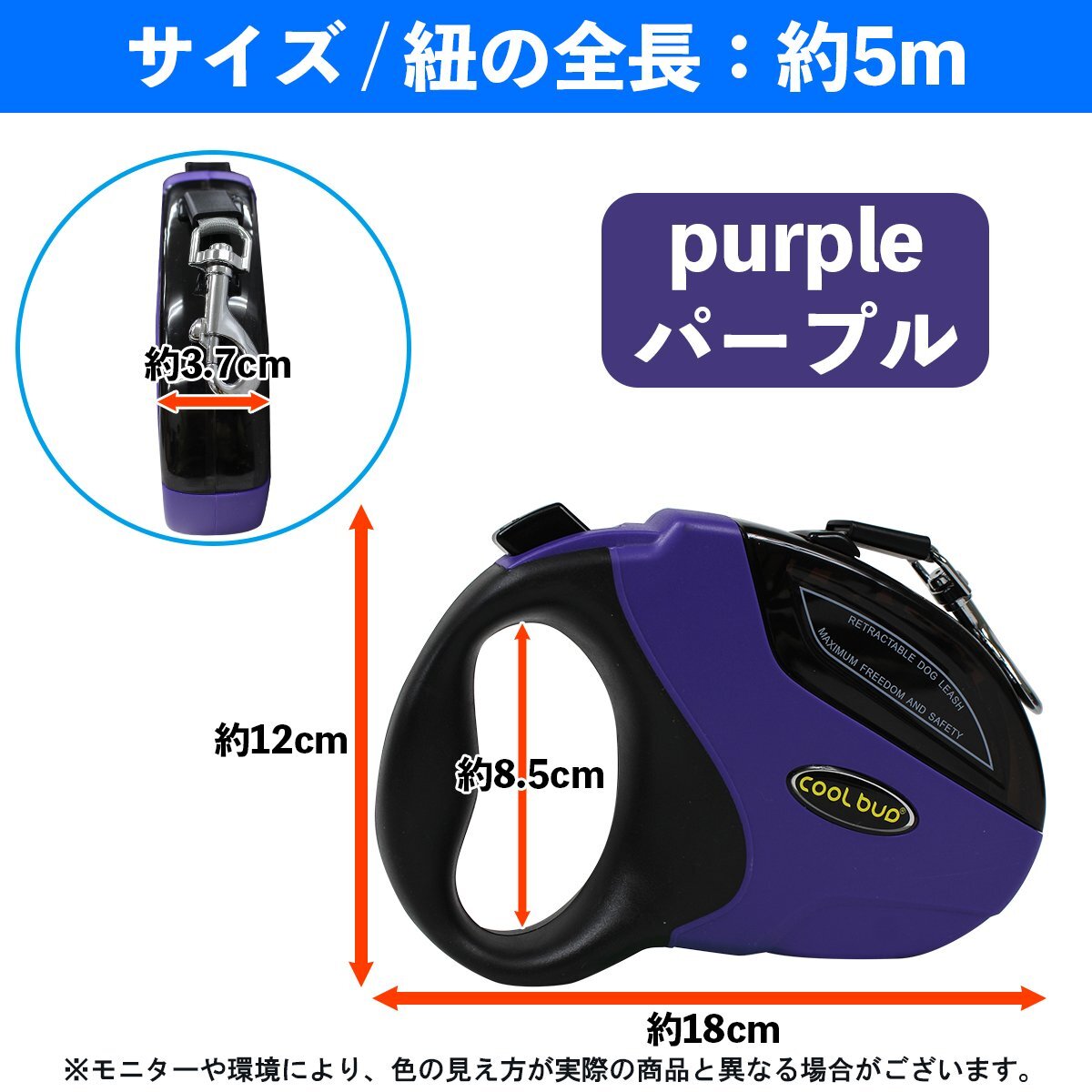 便利なロック機能付き!犬用 伸縮 リード 5m/5メートル 自動巻き取り パープル 紫 ペット 散歩 小型犬 中型犬 犬 ヒモ
