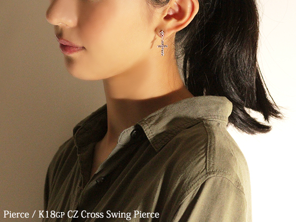 新品/ピアス/K18GP/クロス/揺れる/シルバー/18金/レディース/ホワイトゴールド/両耳/スタッド/十字架/お守り/女性/CZ/ダイヤ/WG