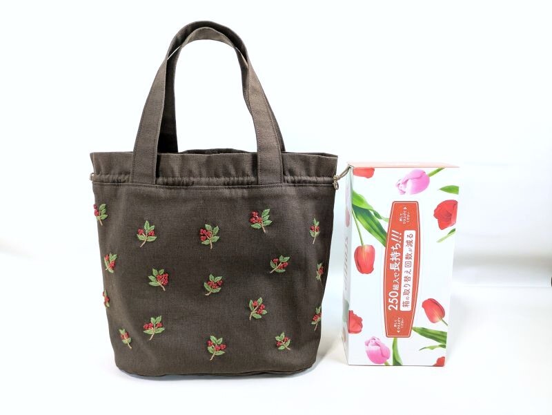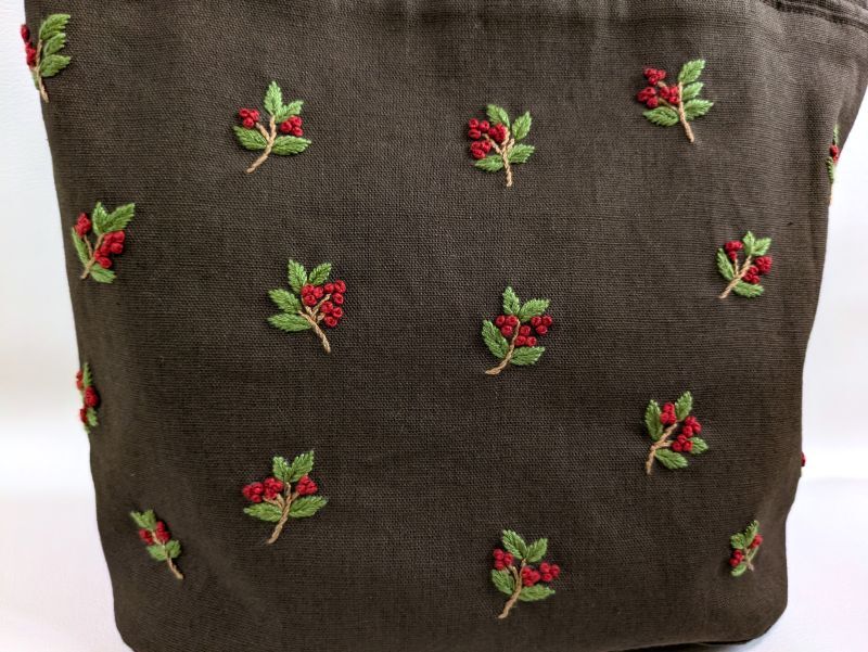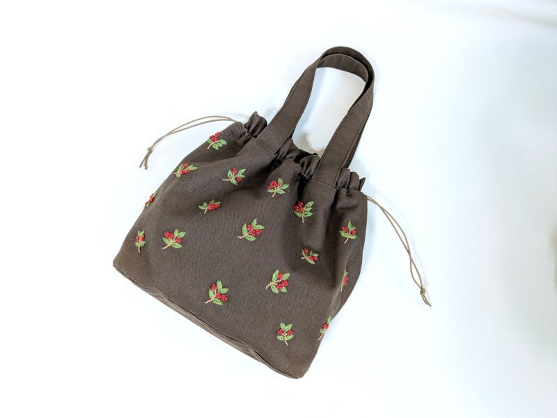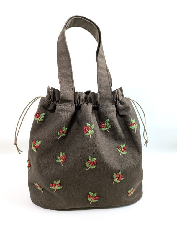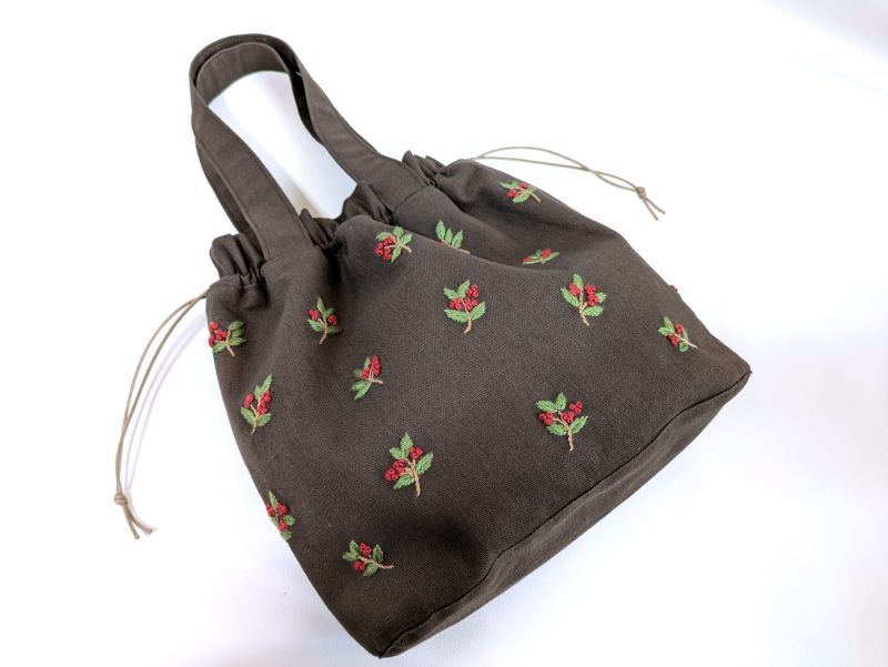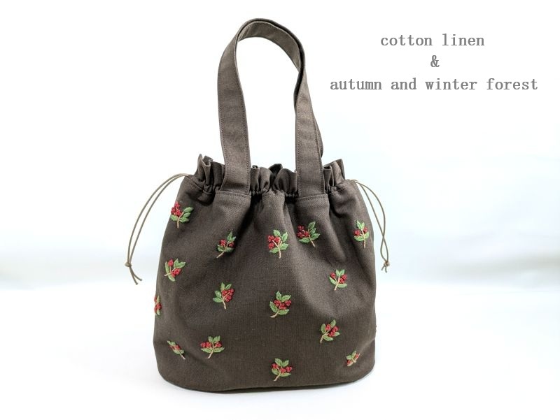 コットンリネン生地に秋冬の森をイメージした赤い植物とどんぐりをちくちく手刺繍した巾着バッグです。