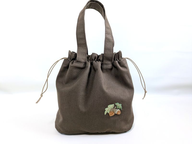 【 コットンリネン楕円底の刺繍巾着バッグ(秋冬の森・こげ茶)】