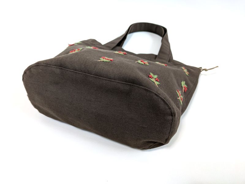 ハンドメイド☆コットンリネン☆楕円底☆巾着バッグ☆手刺繍☆秋と冬の森☆こげ茶