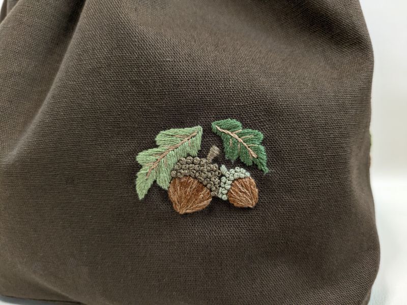 裏面はどんぐりをモチーフに刺繍ステッチを変えて刺繍糸の色も混ぜながら表現しています。