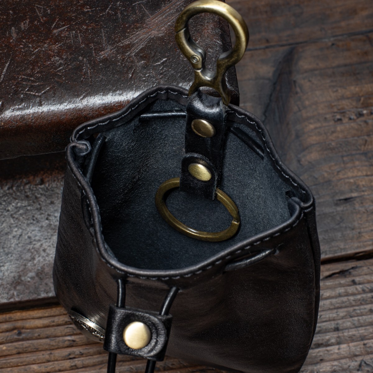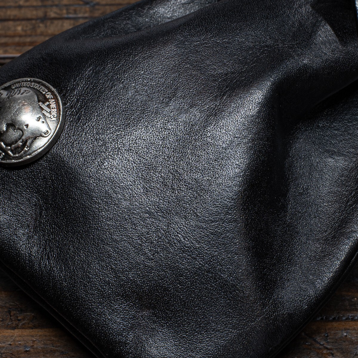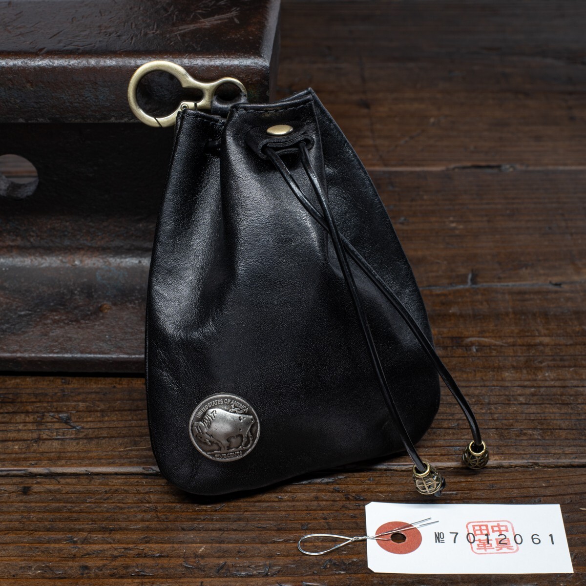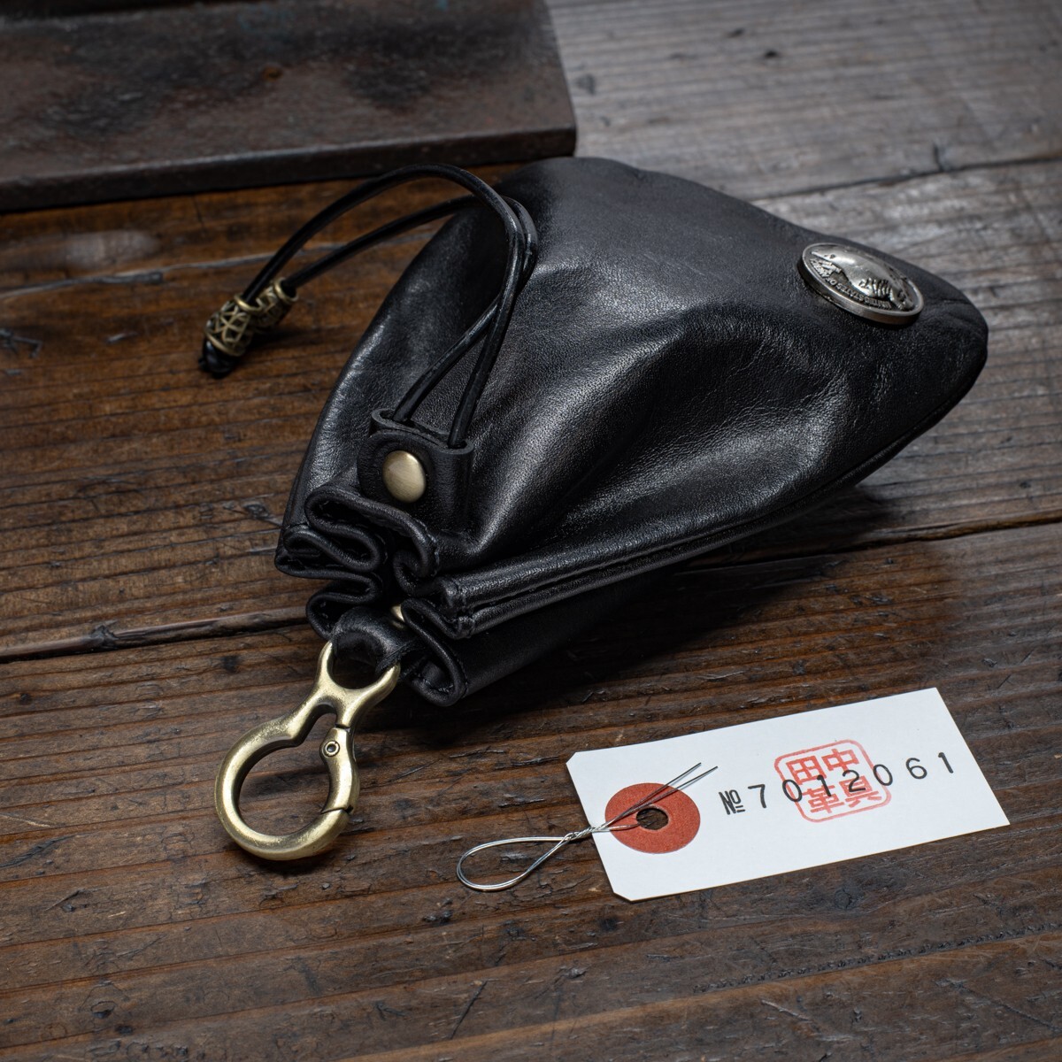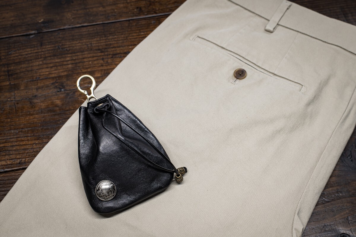 ウォッシュドレザーと呼ばれる本革を使った小さな革袋です。袋の口は革ひもで縛る仕様で、中の物を丁寧に扱いたいときに重宝します。表面には白銅のコンチョが取り付けられ、武骨でヴィンテージ感のある雰囲気に仕上がっています。