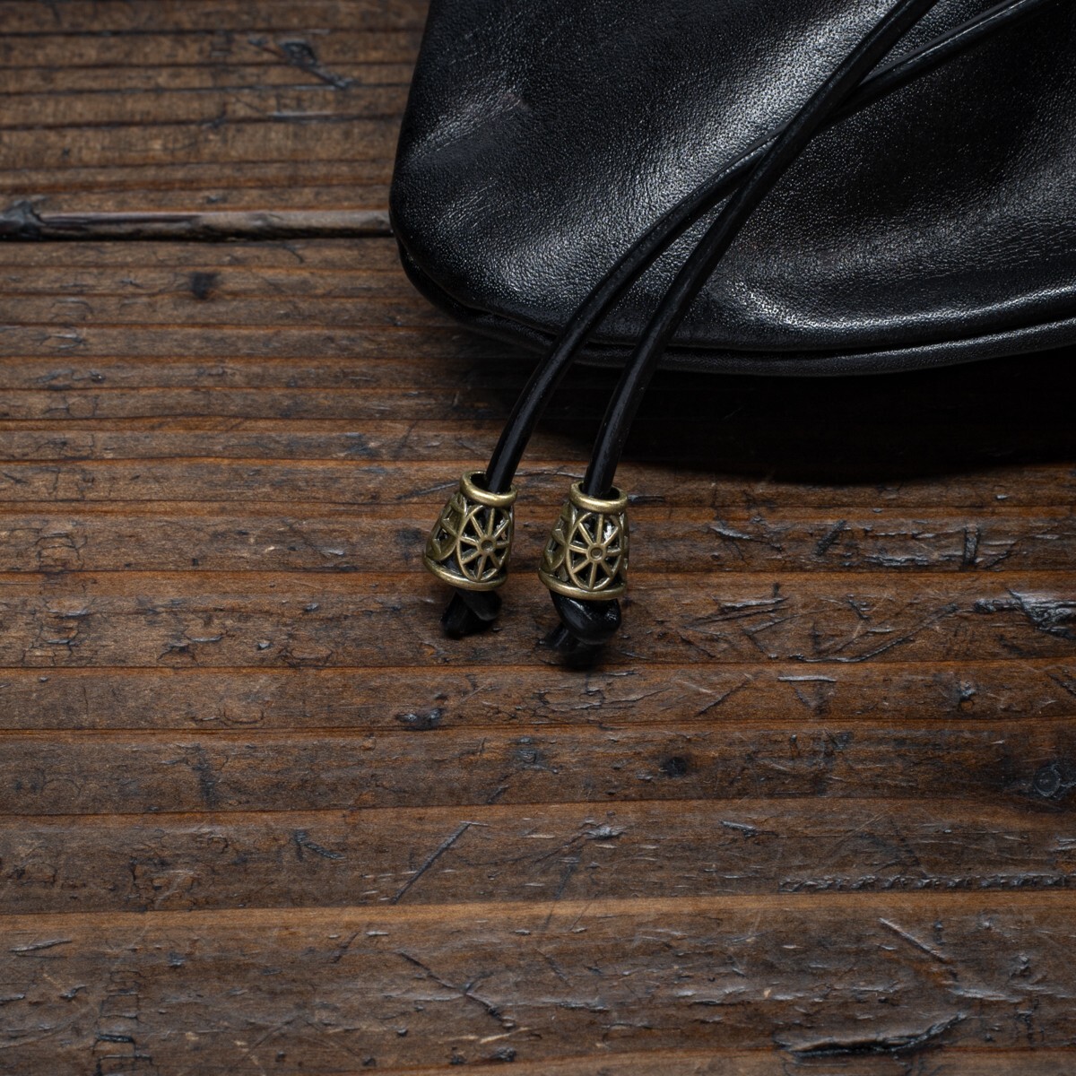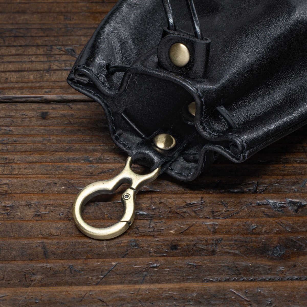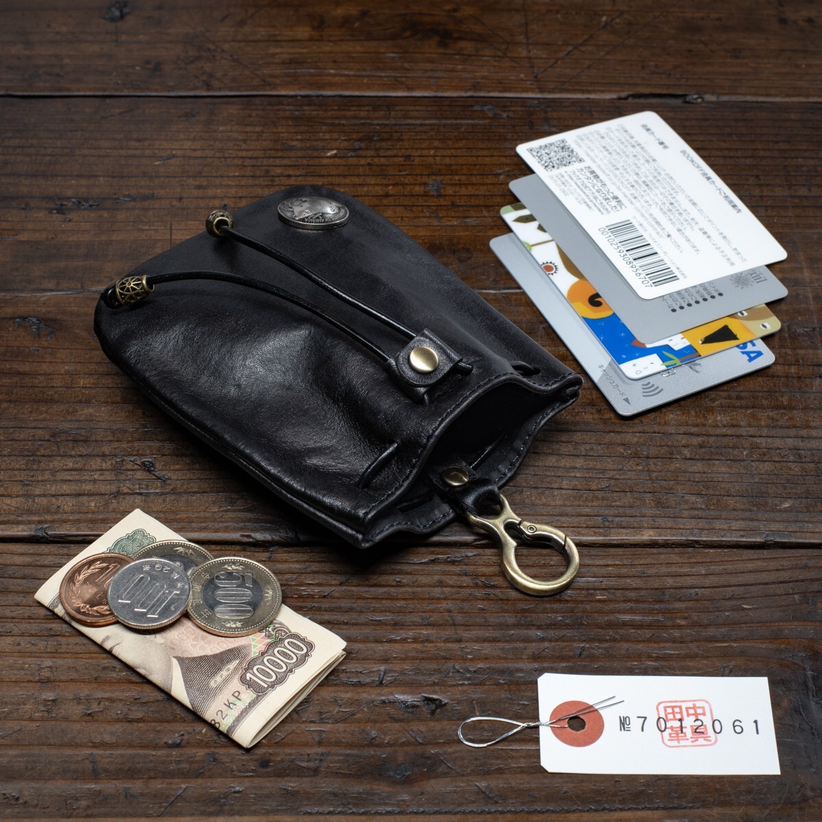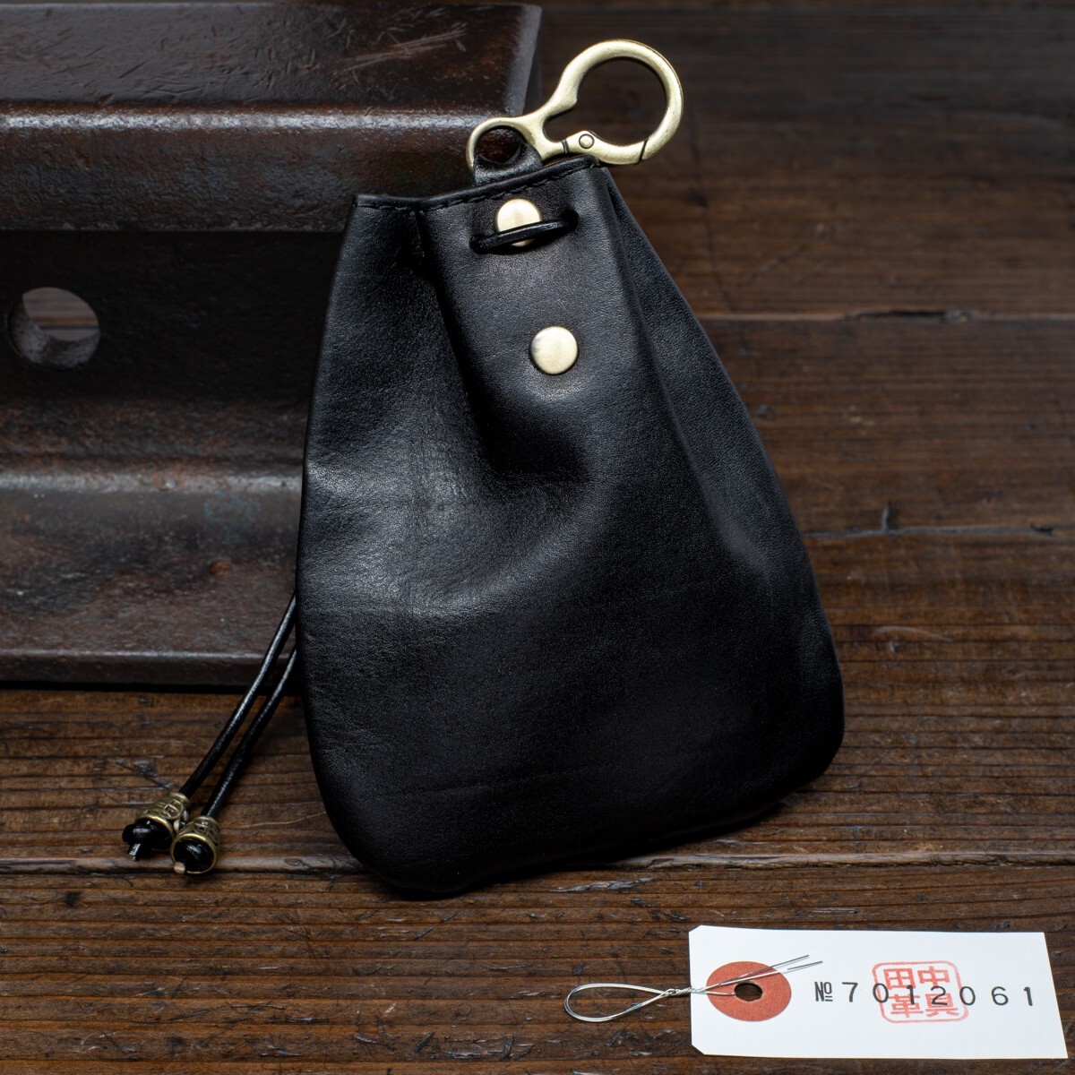 ウォッシュドレザーと呼ばれる本革を使った小さな革袋です。袋の口は革ひもで縛る仕様で、中の物を丁寧に扱いたいときに重宝します。表面には白銅のコンチョが取り付けられ、武骨でヴィンテージ感のある雰囲気に仕上がっています。