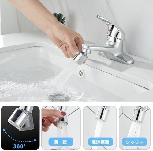 360°回転可能な注ぎ口: 吐水口が360°回転するので、水流が洗面ボウルの隅々まで届き、清潔で衛生的です