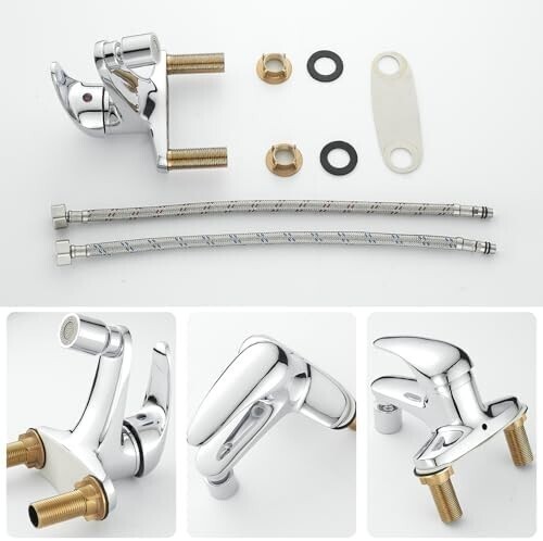 シングルレバー混合水栓: レバーひとつで吐水温度と吐水量を調節できる。1/2インチのパイプに適合する長さ50 cmのホースが2本付属しています。 ホースに取り付けられた 2 つの黄色のプラスチック製ツールは、蛇口をすばやく固定して取り付けるのに役立ちます