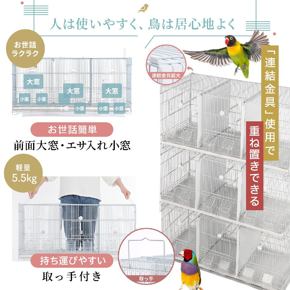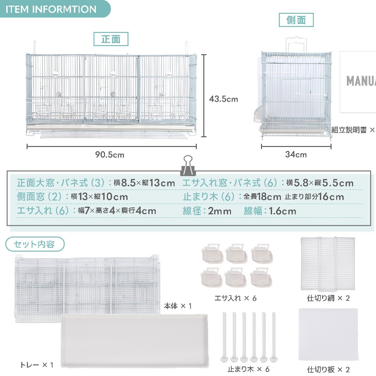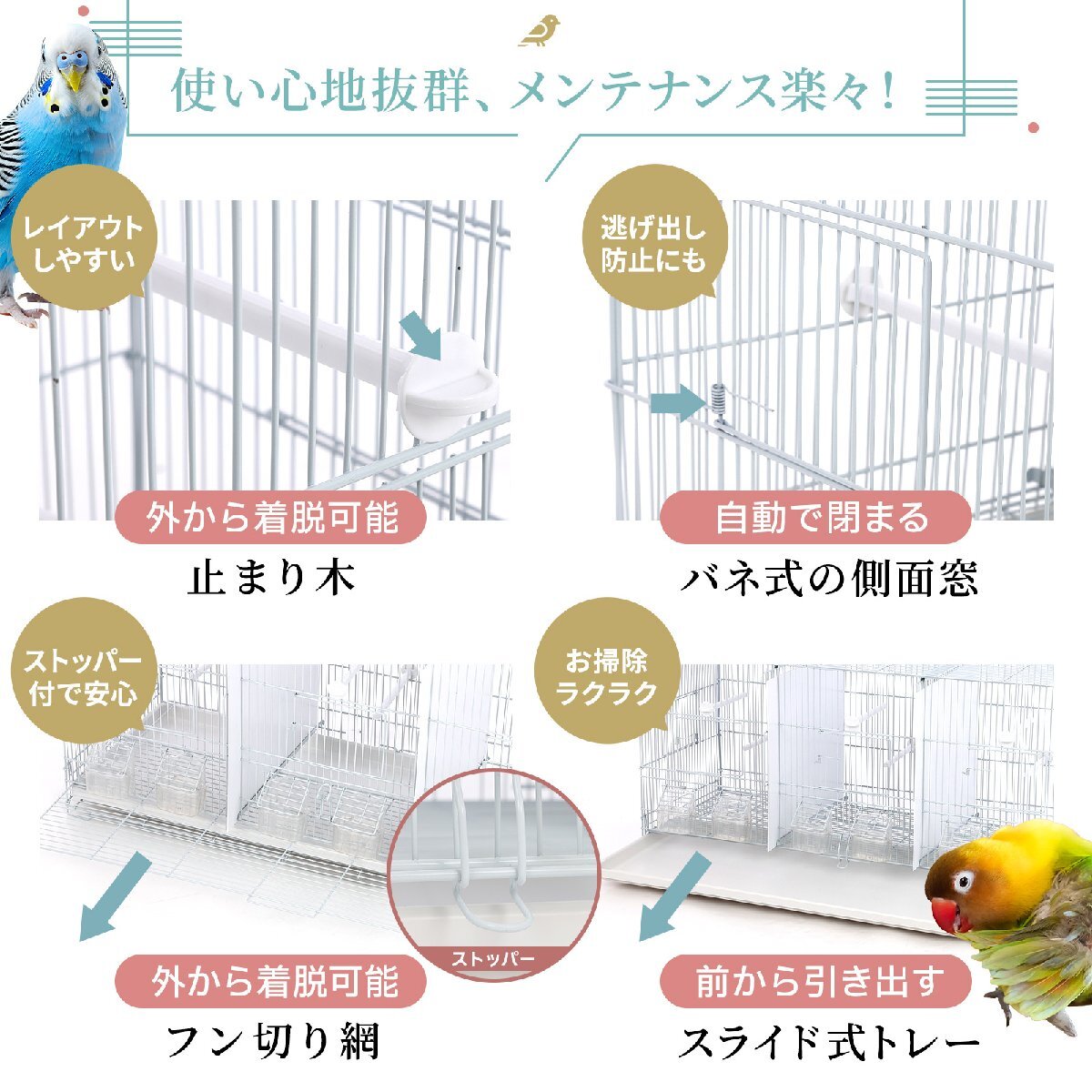 ※付属物は商品仕様に記載されているもののみとなります。 1つの鳥かごが仕切りで3部屋に区分けされたタイプの鳥かごとなっております。 仕切りは取り外し可能なため、1つの鳥かごとしてもご使用いただけます。 底網付きで、底は引き出し式のため掃除がカンタン。 持ち手がついているためケージの移動も気軽にできます。 3部屋あるためカナリヤやセキセイインコなどの小鳥の多数飼育でも広々。 鳥かごを上に重ねることで省スペースで複数の飼育も可能です。 サイズ(約): 幅90.5×奥行き34×高さ43.5cm 1部屋の幅29cm ●付属品 鳥かご本体(スチール製):1個、底はプラスチック(底網つき) 止まり木:6本 プラスチック製のエサ(水)入れ:6個 ※輸入品 海外品により取り扱い説明書は付属はしておりません。 またメーカー品ではない為、取り扱いについてのサポートはできません。 |