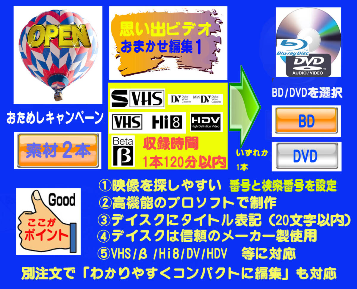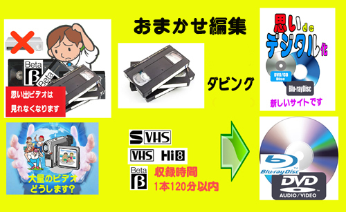 new思い出ビデオ 編集付  ☆ビデオ素材2本を おまかせ編集でコンパクトにBD/DVDデイスク に保存  N2BD-002
