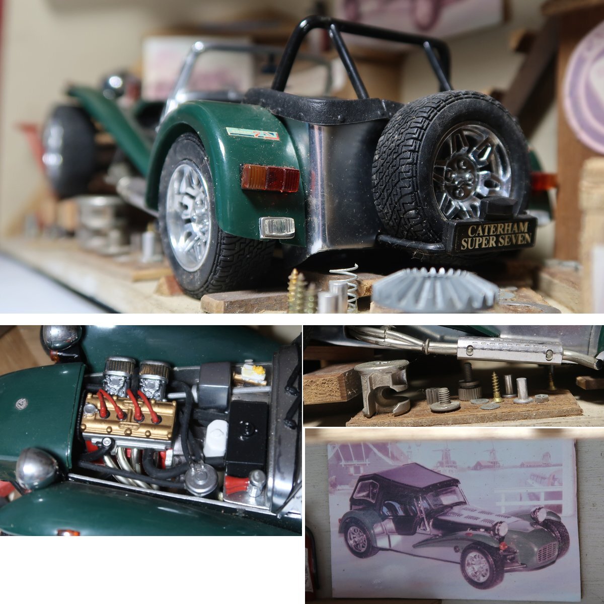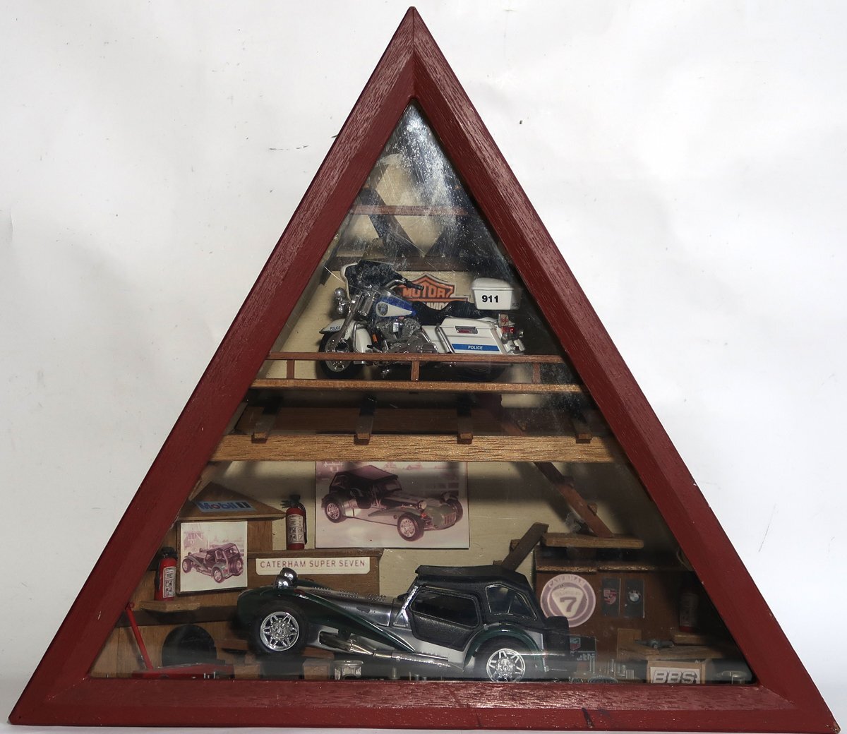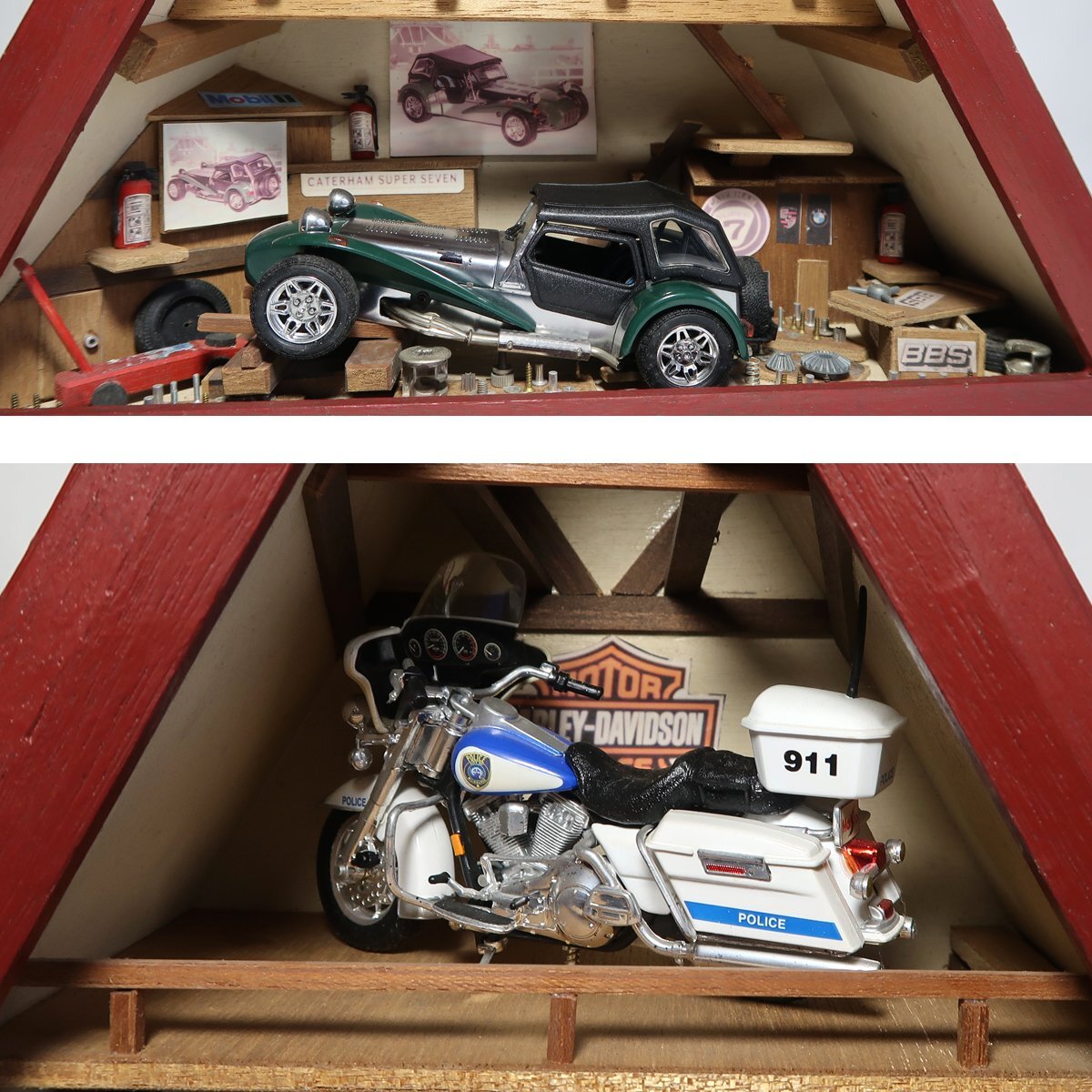 三角形のケースのサイズは高さが39cmくらい、幅は44.5cmくらい、奥行きは14cmくらいです。出品は画像の物のみです。中古ですので汚れや傷があります。埃も入っているのですが、細かい備品があり埃が取れませんでした。また中のものはほとんどクリーニングはしておりません。あとは画像をご覧になって、状態をご確認ください。ハーレーはmaist製です。ケーターハムスーパー7は京商製です。素人(個人)で作ったものですが、かなり労力はかかっているかと思われます。分かることは以上です。お取引後はいかなる理由がありましても返品はできませんし、クレームはお受けできません。