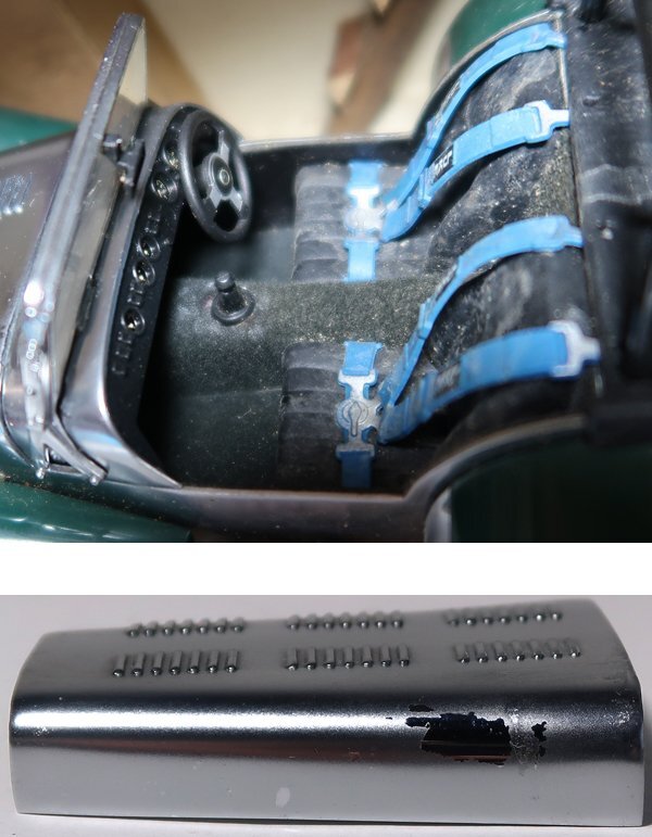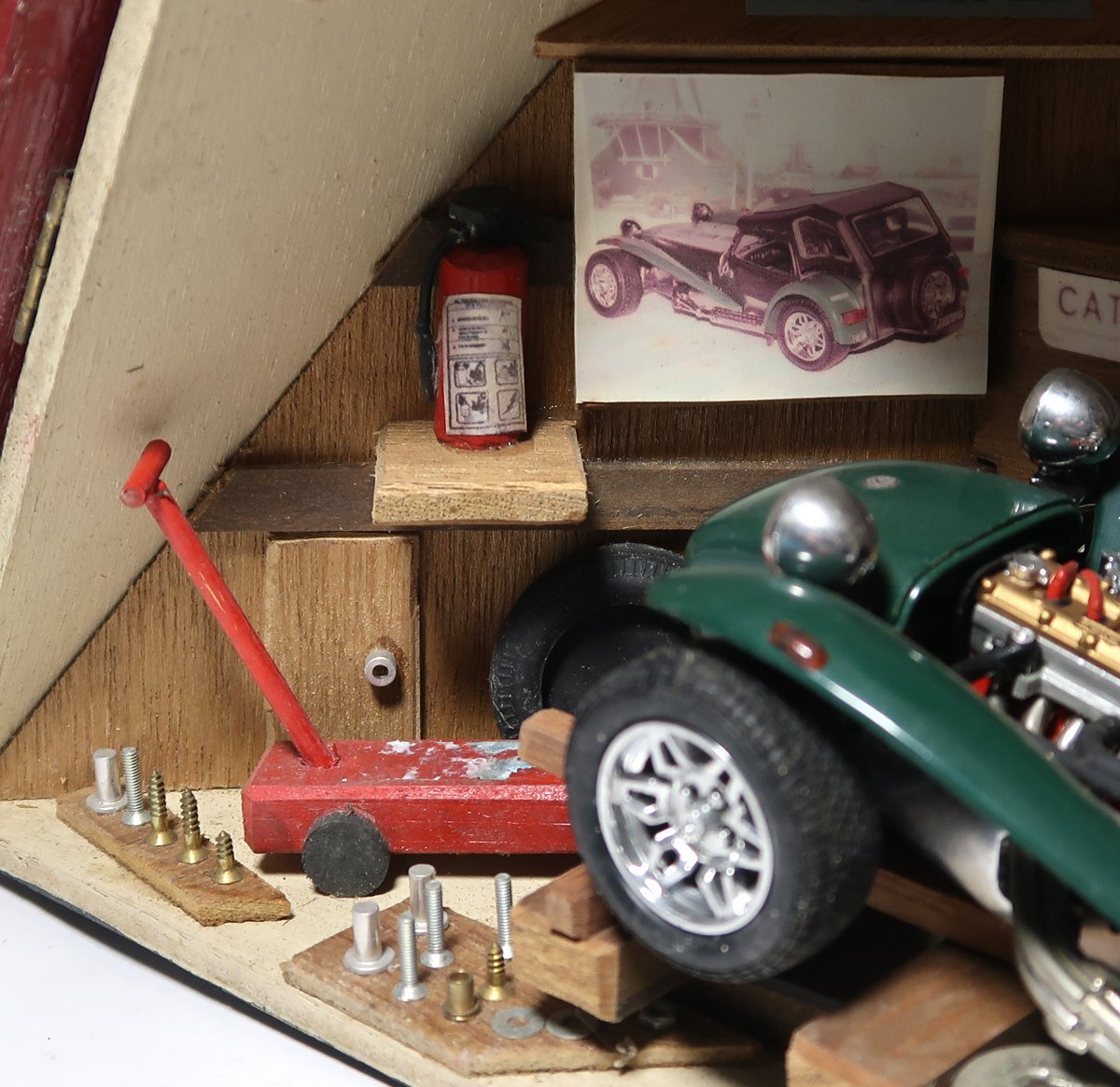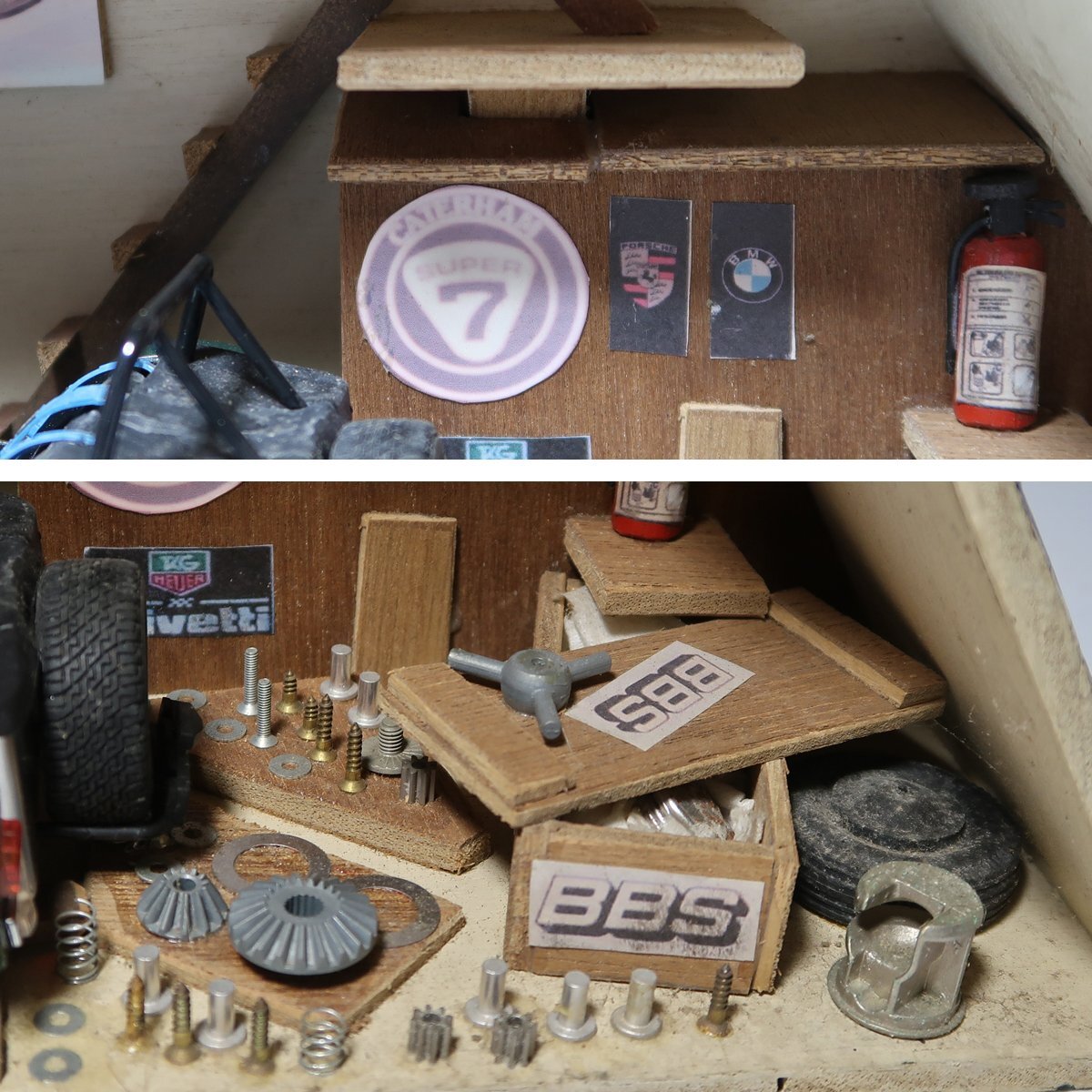 三角形のケースのサイズは高さが39cmくらい、幅は44.5cmくらい、奥行きは14cmくらいです。出品は画像の物のみです。中古ですので汚れや傷があります。埃も入っているのですが、細かい備品があり埃が取れませんでした。また中のものはほとんどクリーニングはしておりません。あとは画像をご覧になって、状態をご確認ください。ハーレーはmaist製です。ケーターハムスーパー7は京商製です。素人(個人)で作ったものですが、かなり労力はかかっているかと思われます。分かることは以上です。お取引後はいかなる理由がありましても返品はできませんし、クレームはお受けできません。