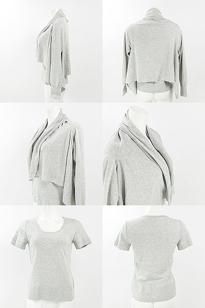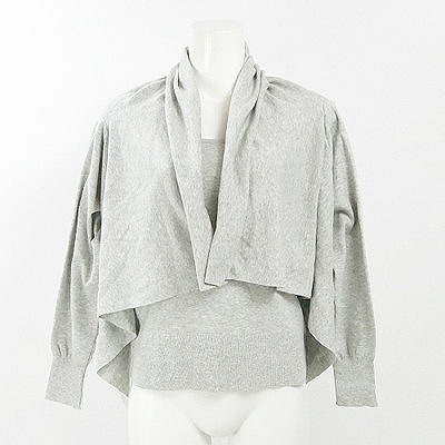 | ストール風の変形カーディガンがオシャレなアンサンブル。 綿100%なので着心地の良いアイテムです。 インナーはシンプルな半袖クルーネックニット。 それぞれ単品でも着回しがききますよ。 タグ付き、未使用品ですのでオススメです。 ニット着丈約55cm袖丈約18cm肩幅約33cmバスト約70cm カーディガン着丈約74cm袖丈約50cmバスト約80cm 【サイズ】:(36) 【素 材】:(綿100%) 【 色 】:(グレー) 【程 度】:(S) 管理番号 2279-20110901-022 139-023 | ||||