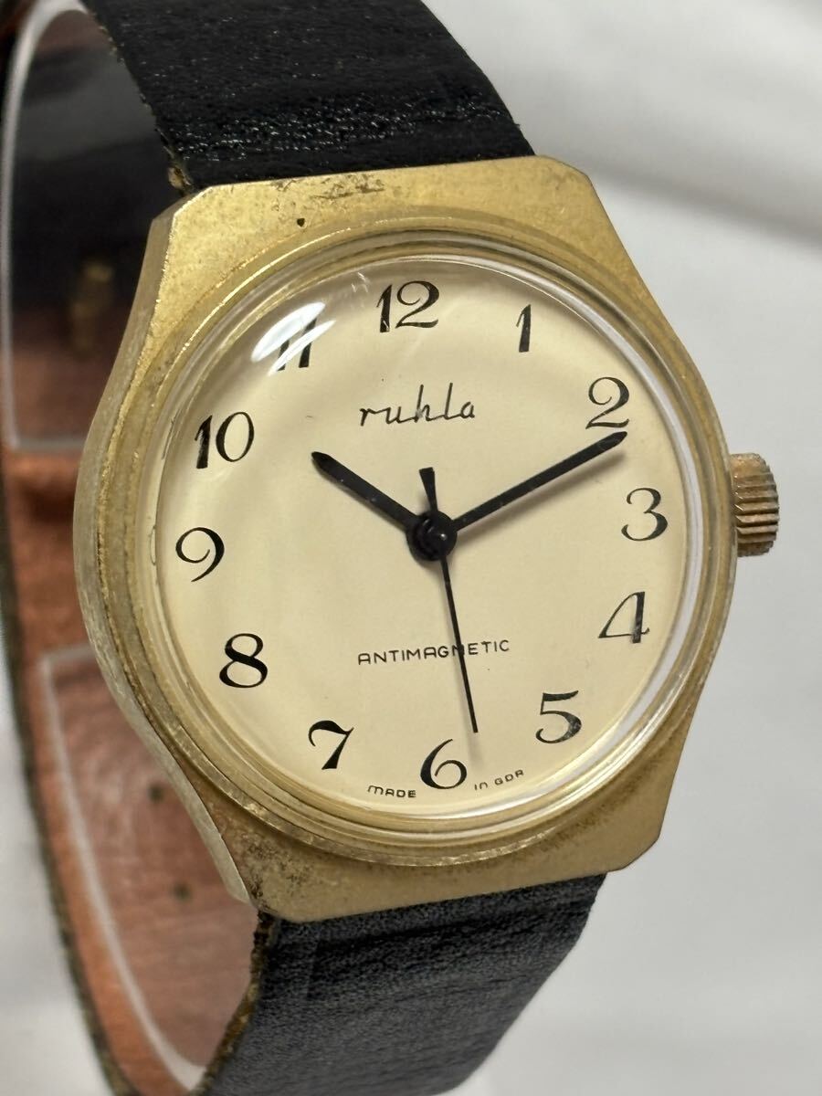 こちらruhla ルーラ ドイツ製 手巻き アイボリー メンズの出品をさせていただきます。ベルト面に劣化あり、風防やケース面に小傷やスレなどございます。動作に関しては稼働品。竜頭使用における針の操作は問題ございません。長時間の動作確認は行なっていませんのでメンテナンスにつきましては落札者様の方でお願い致します。その他未確認ですが、ご検討宜しくお願い致します。