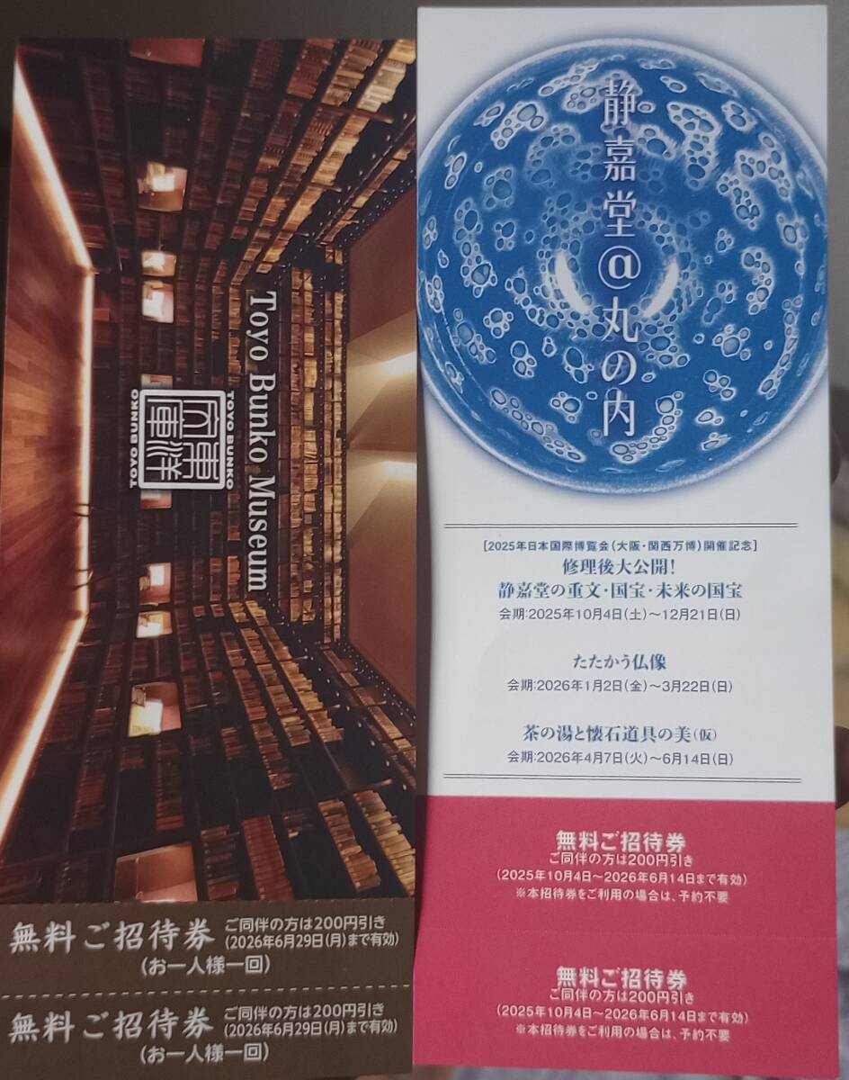 静嘉堂文庫美術館 東洋文庫ミュージアム 無料招待券 静嘉堂文庫美術館(東京都千代田区丸の内)2026年6月14日まで 東洋文庫ミュージア(東京都文京区本駒込)2026年6月29日まで ★静嘉堂文庫美術館 【2025年日本国際博覧会(大阪・関西万博)開催記念】修理後大公開! ※静嘉堂の重文・国宝・未来の国宝 会期:2025年10月4日(土)〜12月21日(日) ※たたかう仏像 会期:2026年1月2日(金)〜3月22日(日) ※茶の湯と懐石道具の美(仮) 会期:2026年4月7日(火)〜6月14日(日)
