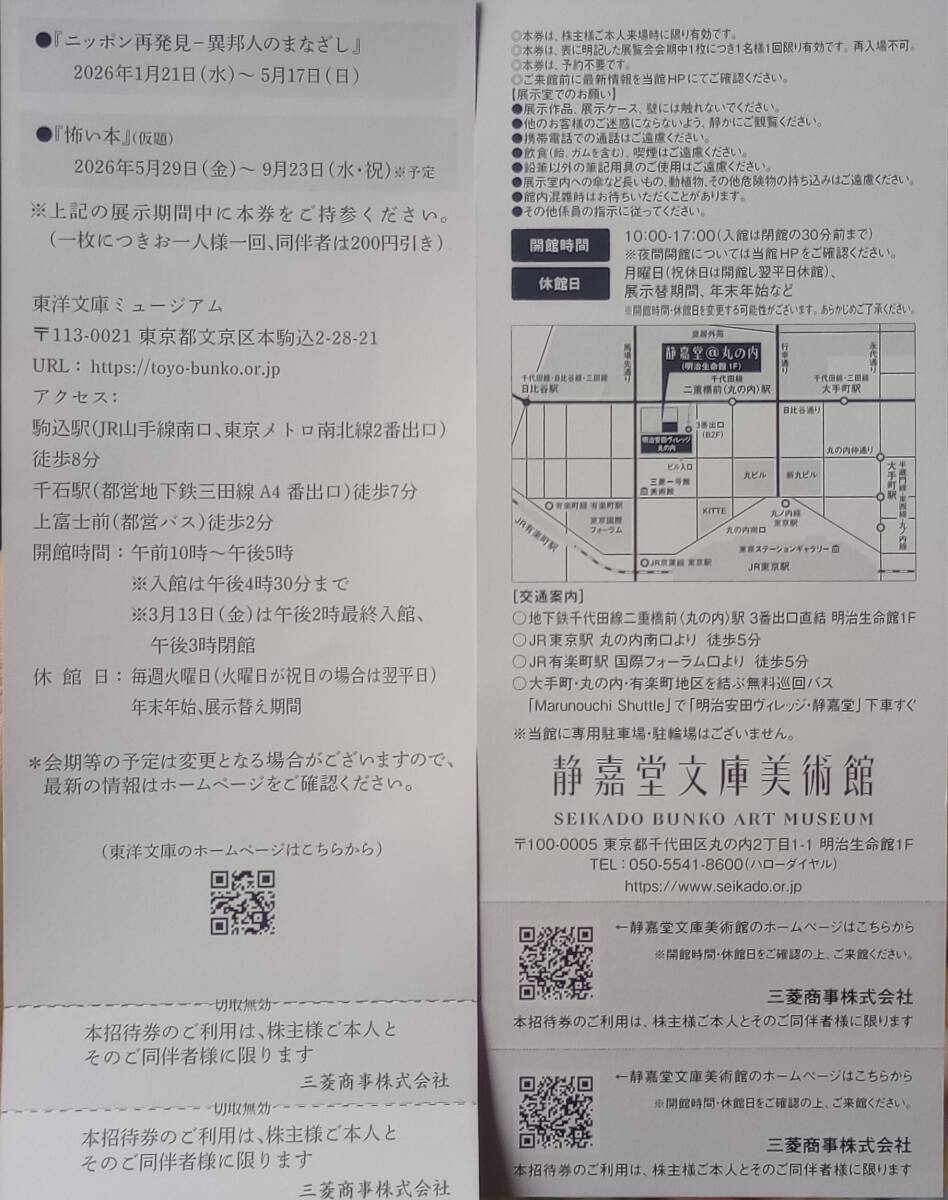 静嘉堂文庫美術館 東洋文庫ミュージアム 無料招待券  計2枚 株主優待 三菱