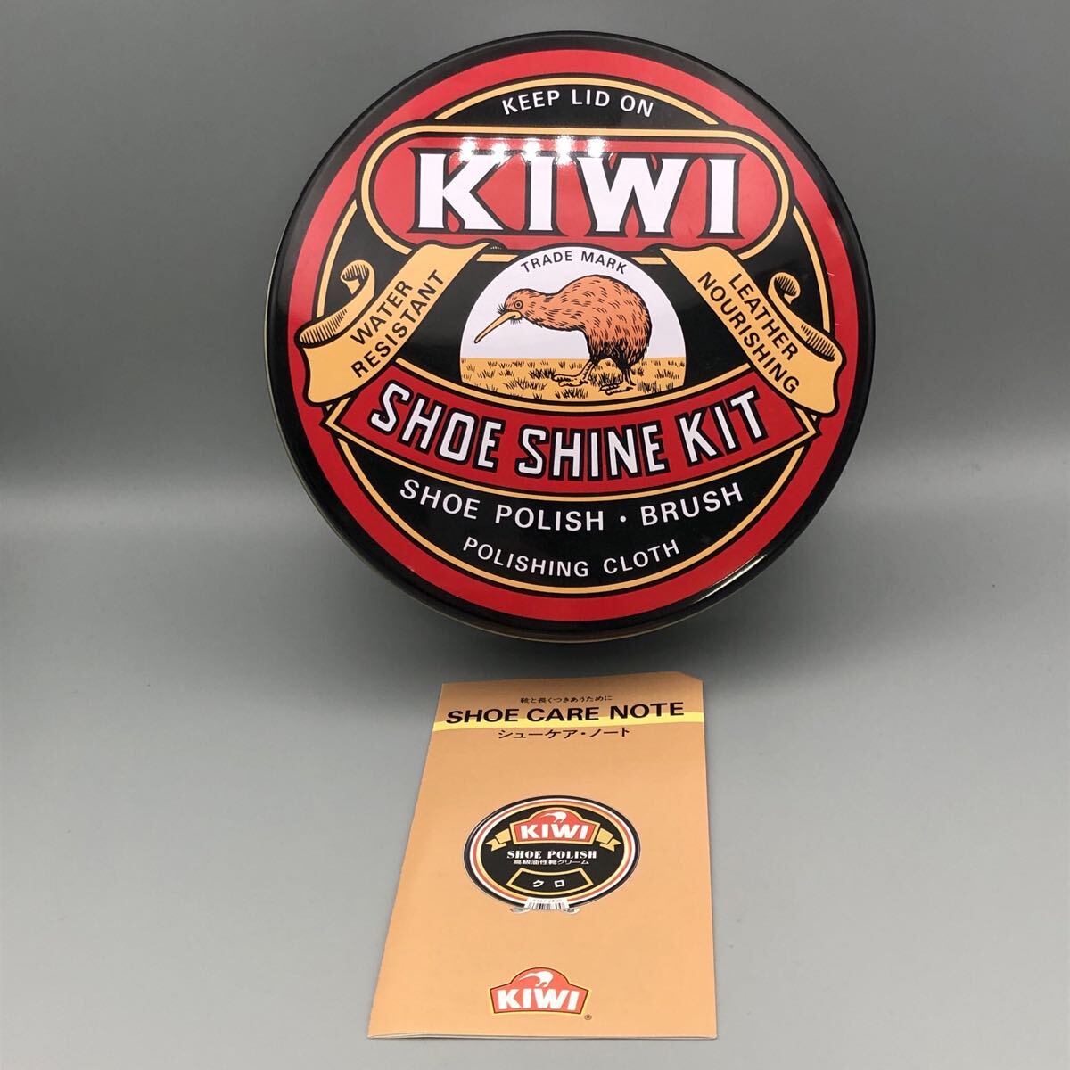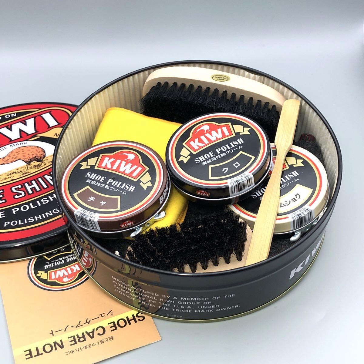 | ★岡11175【昭和レトロ】KIWI キィウイ シューシャインキット 缶入り 高級油性靴クリーム 黒 茶 無色 ブラシ 磨きクロス セット | |