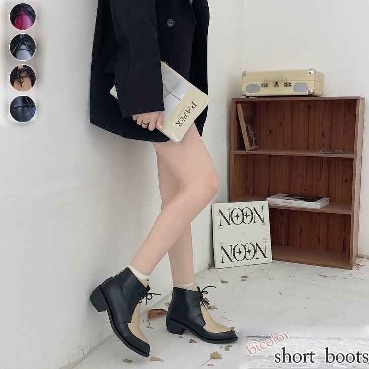 ・バイカラーデザインでモード&エレガントな印象のショートブーツ。