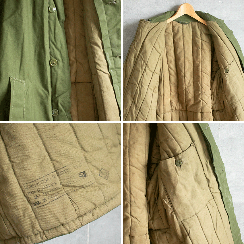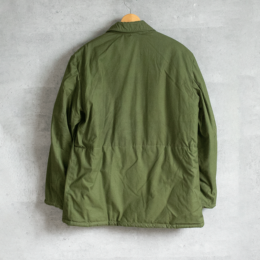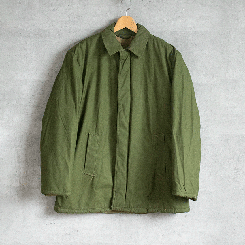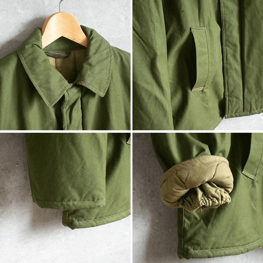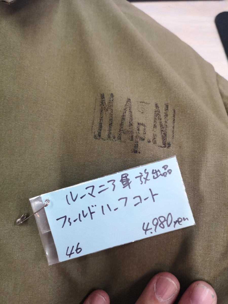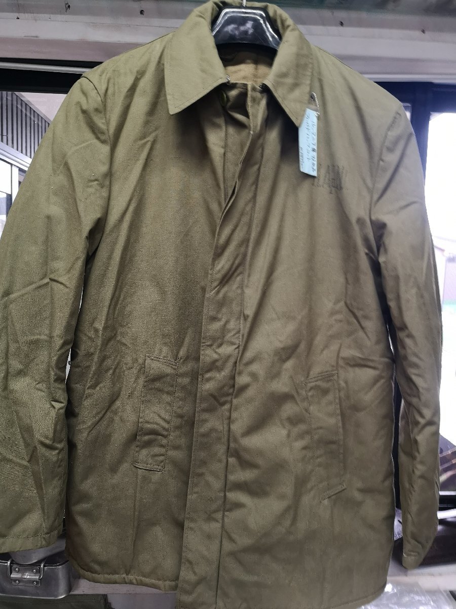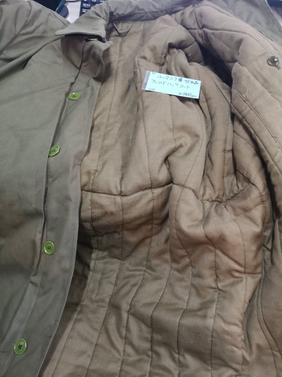ルーマニア軍にて採用されていたフィールドハーフコートです。5枚目までの写真は流用です。 実物はすこし薄い緑でインナーは薄茶です。 シンプルなデザインのハーフコートで裏地のキルティングが特徴的です。 中綿がしっかり詰まっており防寒性は高く、袖口の内側にはゴムで絞られた生地が付いており風の侵入を防いでくれます。 シンプルかつ実用的なアイテムによりタウンユースからアウトドアまで幅広く活躍してくれます。 ●サイズ 44( 身幅56cm/肩幅43cm/着丈73cm/袖丈57cm ) 46( 身幅58cm/肩幅45cm/着丈75cm/袖丈59cm ) 48( 身幅60cm/肩幅47cm/着丈75cm/袖丈59cm ) 50( 身幅62cm/肩幅49cm/着丈78cm/袖丈61cm ) ※実物アイテムの為、上記サイズに当てはまらない場合がございます。予めご了承下さい。 ●素材:コットン ●状態:デッドストック ※デッドストック(未使用品ですが長期にわたり倉庫にて保管されていた商品)の為、日焼け、色ブレがある場合がございます。 予めご了承の上ご注文下さい。 沖縄離島を除く全国500円でお送りいたします、落札価格にプラスでお願いいたします。