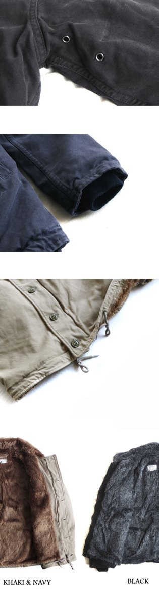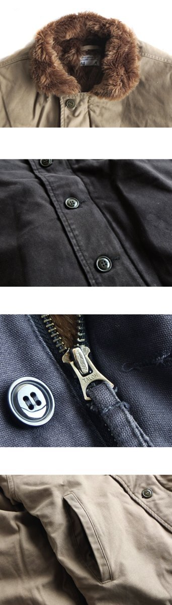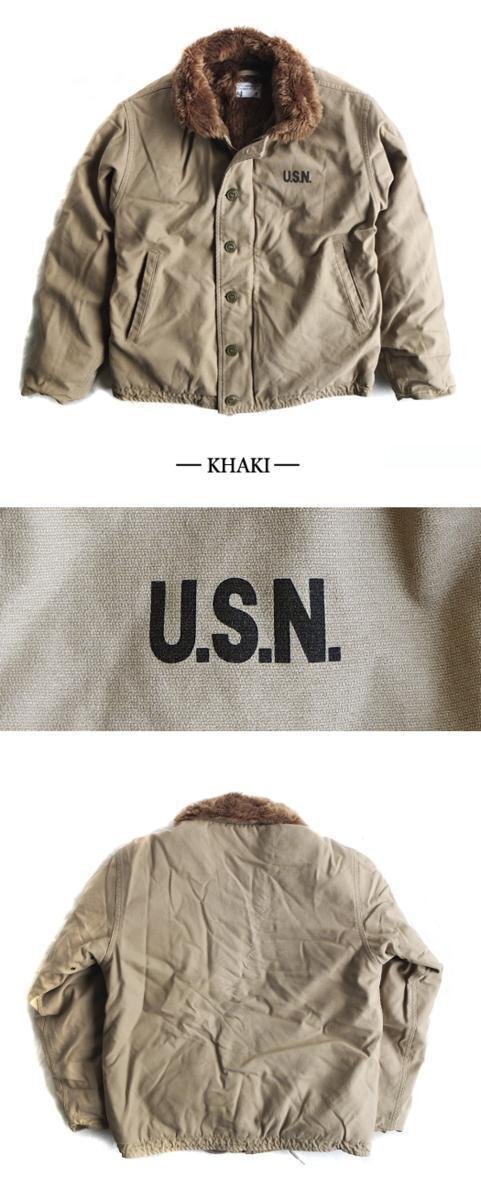 N-1デッキジャケットは、1944年に正式採用されました。生地は通称ジャングルクロスと呼ばれる織りの細かい生地を採用し、インナーにはアルパカが使用されました。1945年には、カラーがネービーからカーキへと変更になり、仕様も細部が変更されました。また、インナー部のアルパカウールの毛足が長いタイプ(戦中型)からアルパカとウールの混紡で、毛足の短いタイプ(戦後型)になり、一部は1960年代の初め頃まで使用されました。 このレプリカモデルは主に40年代半ばから50年代前半に使用された戦中モデルをレプリカしたものです。ジッパーはTALON社製を使用しています。 インナーにはアルパカを使用せず、アクリルを使用しておりますが、色や質感は実物に近い風合いが出ております。 ※中古加工はUSEDの風合いを出すために、強目の洗いをかけております。その為、小さなキズ等がございますのでご了承下さい。。 サイズ表記は36で丈62センチ、胸囲110センチ、両袖58センチ程度。日本人的にはメンズS/Mサイズ程度です。沖縄離島を除く全国500円でお送りいたします、落札価格にプラスでお願いいたします。 3枚目以外の写真は流用です。