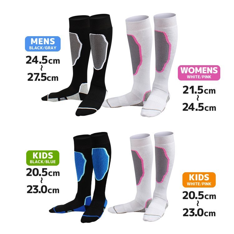 ◆スキーソックス スノボ靴下 2足セット 黒/白/青 男女 子供 アウトドアソックス あったか靴下 厚手 吸汗 高通気 衝撃吸収 ハイソックス 防寒 保温 釣り 登山【白S】SS144NS2