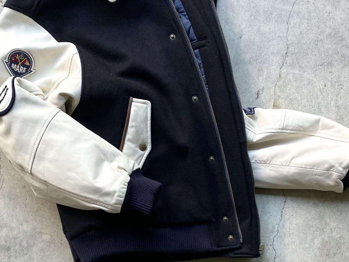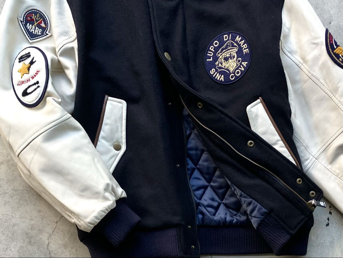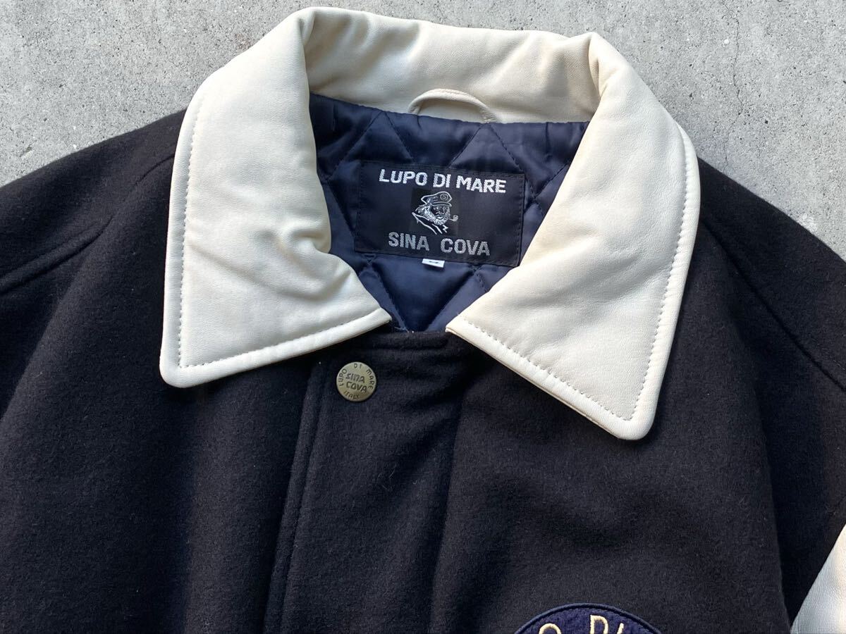 美品 SINA COVA 袖革 スタジャン M シナコバ メンズ ブルゾン ジャケット 革ジャン 本革 羊革 ラムレザー 刺繍 サガラワッペン フルデコ 紺