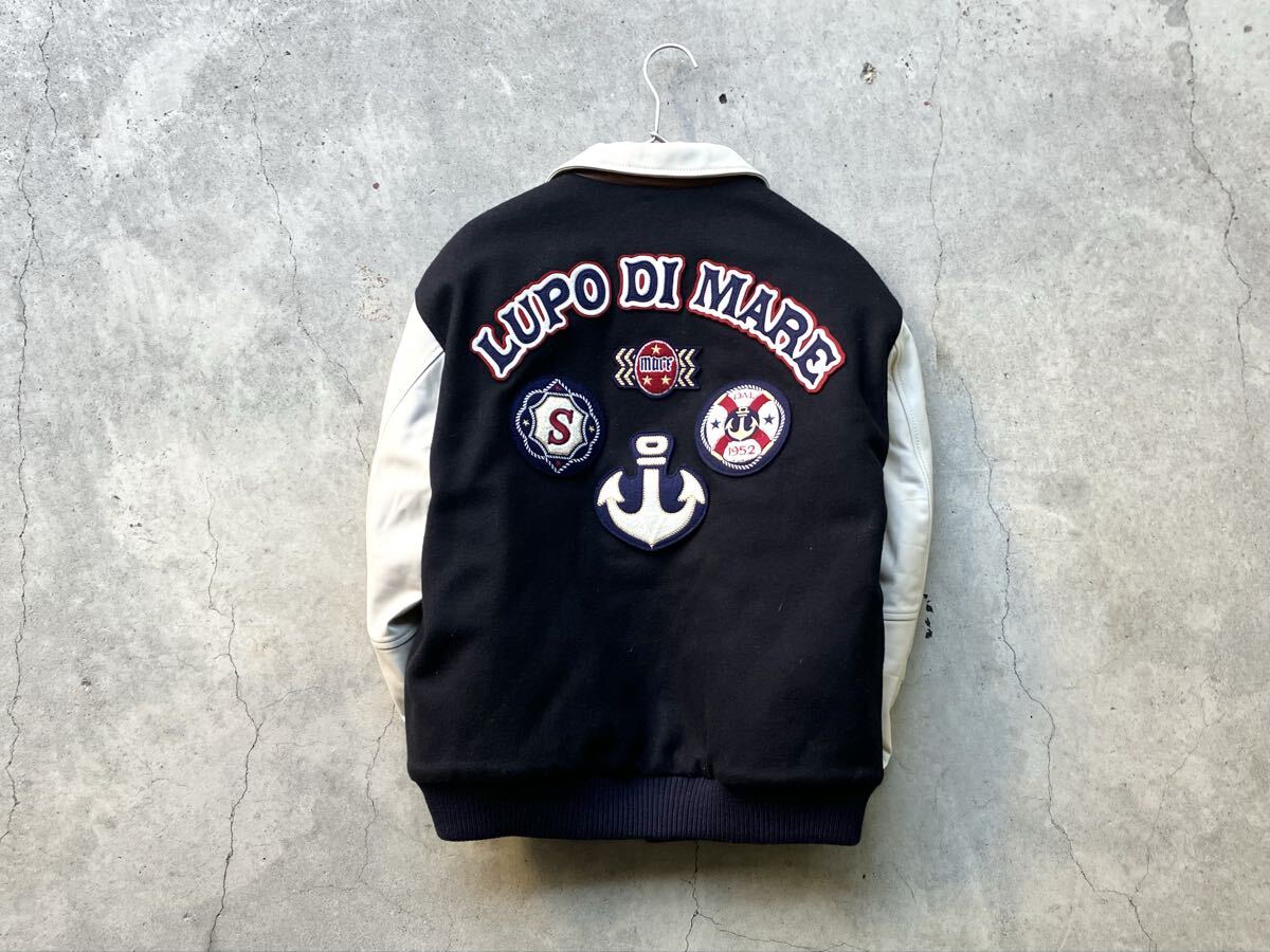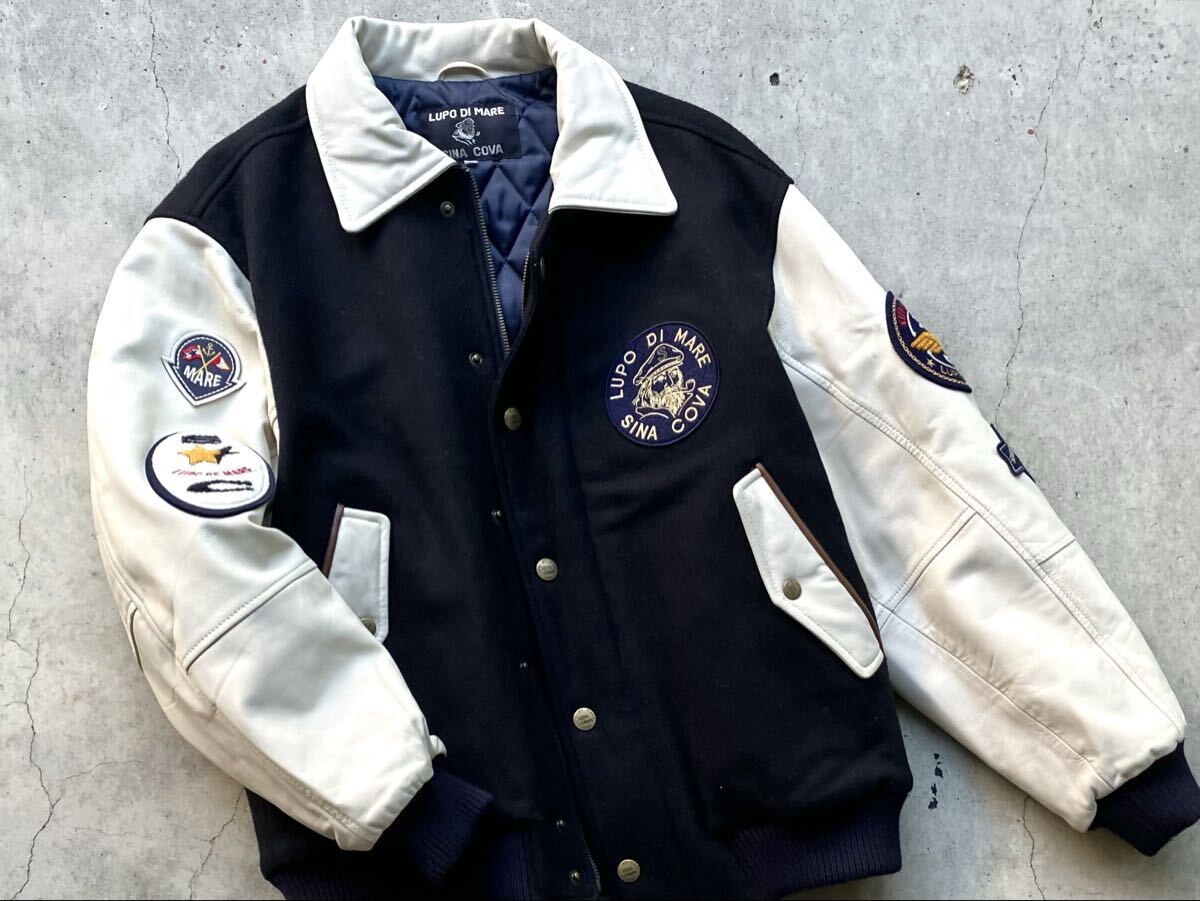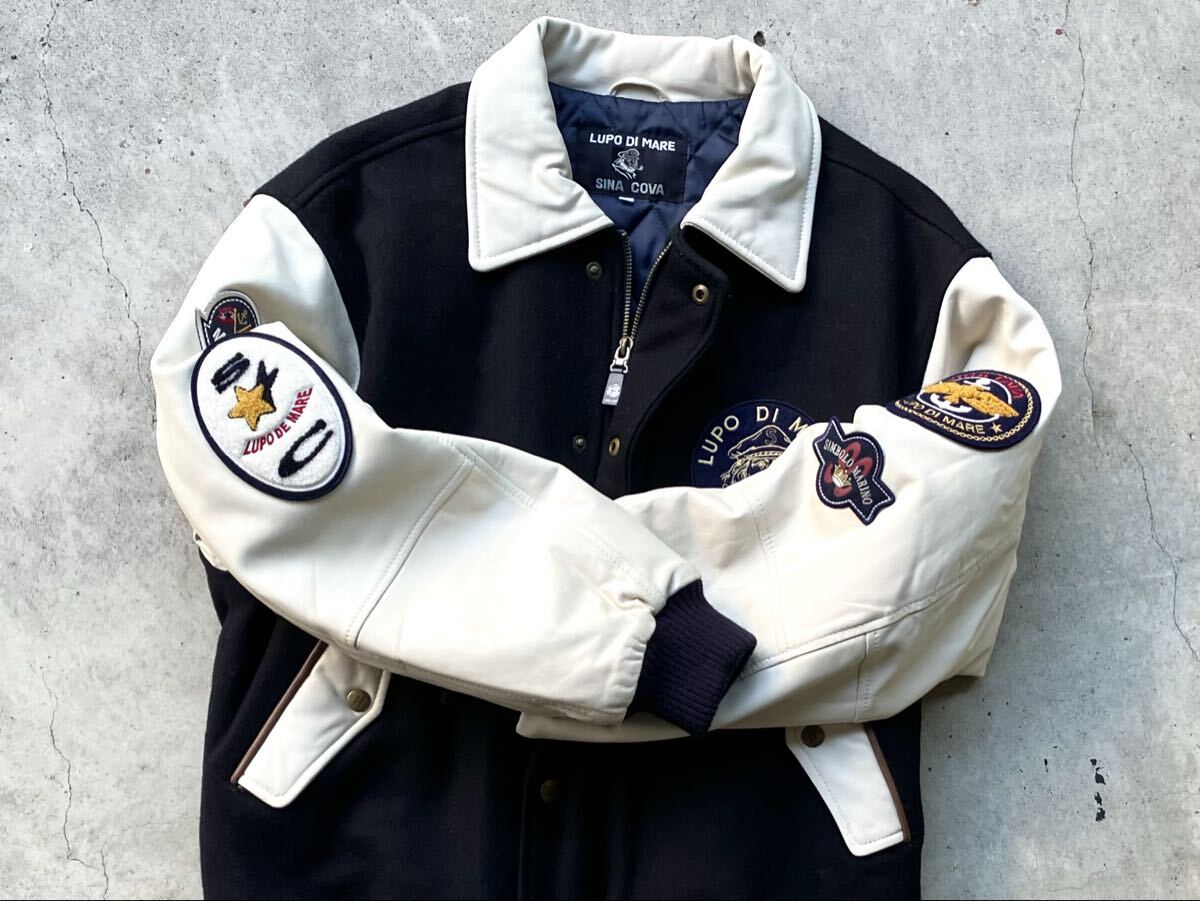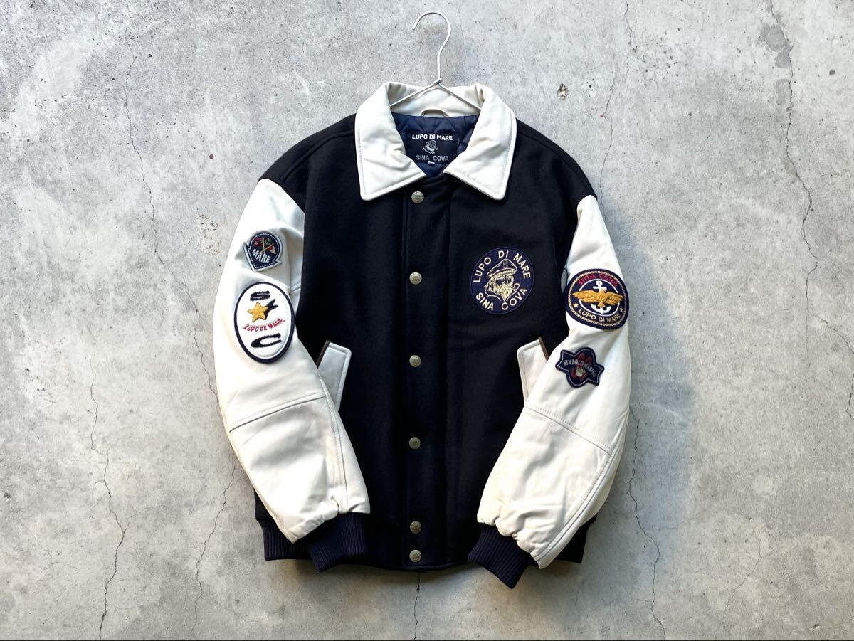 美品 SINA COVA 袖革 スタジャン M シナコバ メンズ ブルゾン ジャケット 革ジャン 本革 羊革 ラムレザー 刺繍 サガラワッペン フルデコ 紺