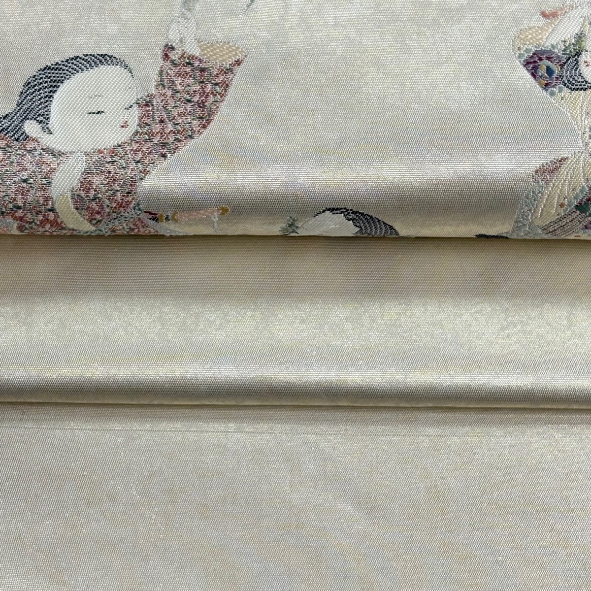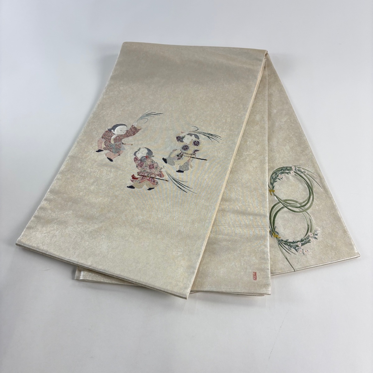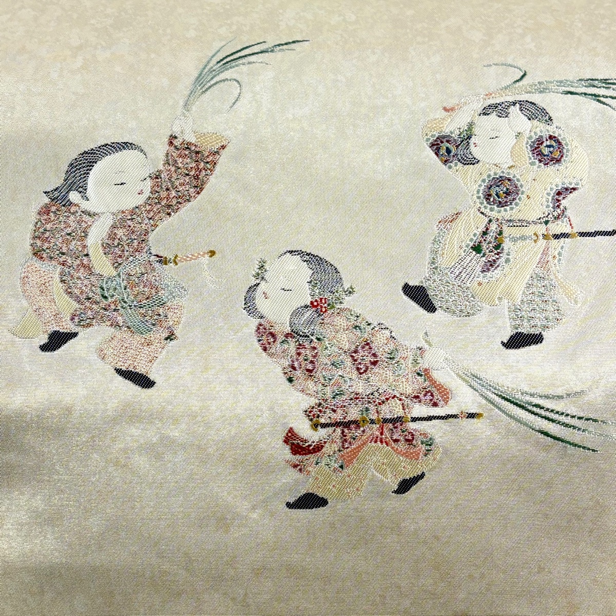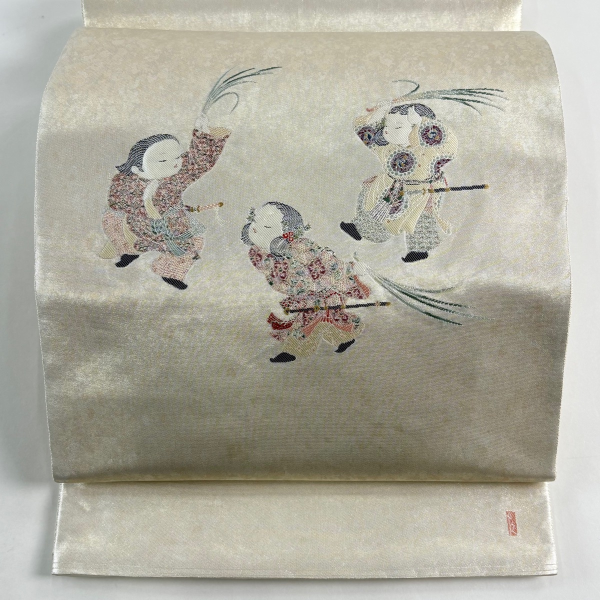 | 袋帯 逸品 長嶋成織物 落款 由水十久監修 関西仕立て 童 菖蒲 箔 銀色 お太鼓柄 正絹 【中古】 |