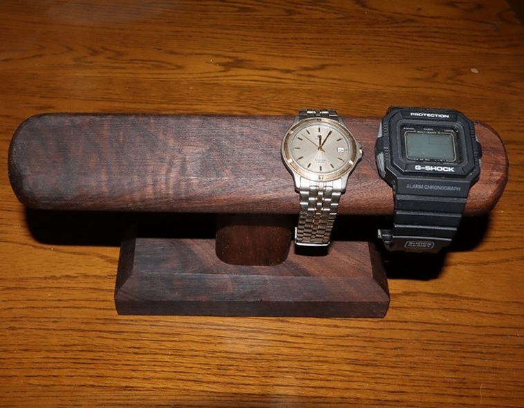 こちらは、美しい杢目のウォールナットで製作した腕時計スタンドになります。